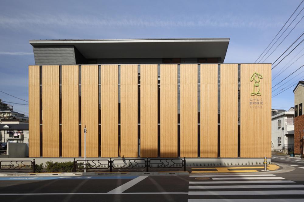 木質系材料の中でも、面材(壁・床)と線材(柱・はり)を製造することができるLVL(単板積層材)を主に用いた準防火地域の3階建て動物病院である。建物用途が畜舎となるため、準耐火建築物(延べ面積1,500㎡以下)で設計しており、道路面は1時間準耐火構造の大臣認定を取得したLVL厚板外壁、その他の部分は、柱・はりを準耐火構造告示のせっこうボード等で耐火被覆している。LVL厚板だけで構成すると配線・配管スペースの確保など困難なことも多いため、柱・はりの軸組とLVL厚板の併用工法となっている点が特徴的である。
