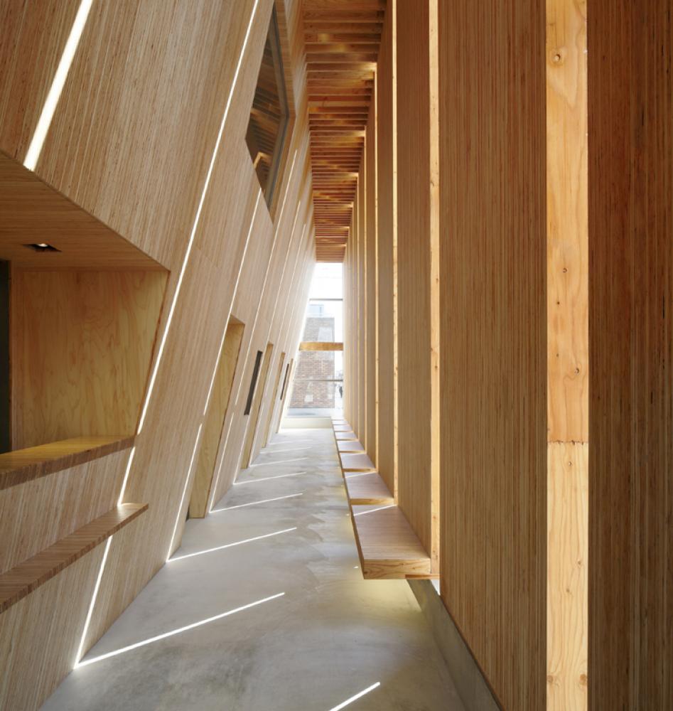 LVLの厚板の壁が前面道路に向かって象徴的に並んでいる。その潔さとスケール感はまちの景観を生み出していく都市木造の一つの形を提示している。