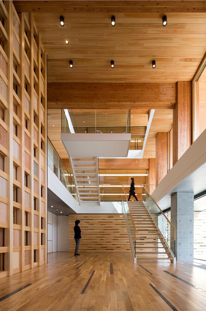 この建物では、もともと1階のRC造は津波対策、敷地境界のRC造は延焼防止が主な目的で用いられており、さらにそれらを耐震要素として構造的にも利用している。主要空間を構成する木造部分では、深い軒とバルコニーによる水平線と柱梁の線材による架構が表現され伝統的に用いられてきた木造建築の要素を用いて表現されている。既存の桜の木に配慮した平面計画から生まれた特徴的な円弧上の深い軒とバルコニーは、木材の外壁の耐久性を向上させるほか、外壁・軒裏の木材をメンテナンスするためのデッキとしても機能することになる。また、さまざまな木質材料が用いられている吹き抜け空間でも、宙に浮かぶ折り返し階段では鉄骨部材を用いて軽快さを演出している。