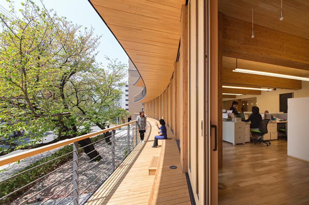 「燃えどまり型耐火集成材「燃エンウッド」を初めて用いた都市木造建築である。1階をRC造、敷地境界にRC造の壁を用いるなど純粋な木構造というには抵抗がある人も多いだろう。しかし、都市に建設される都市木造では、どうしても都市部の周囲の環境に応じてさまざまな構造材料が用いる必要が生じる。特に、他構造に比べて後発で、構造性能、防耐火性能の向上が現在進行形の都市木造では、無理に木造純粋主義になるより適材適所の考えのもと混構造となるのが今のところ自然である。他構造材料の力を利用することにより、木材を用いた快適な空間が生み出されるのであれば、それでよいのではないだろうか。
