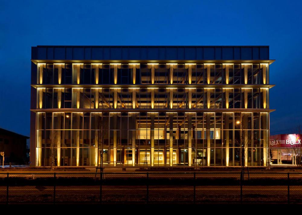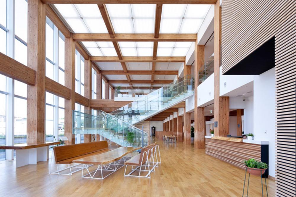 木質ハイブリッド鋼材内蔵型集成材を用いた国内3事例目の建物で、木材を扱う企業のオフィスビルである。過去2例より規模・木材使用量とも大きく、非常にチャレンジングなプロジェクトである。特筆すべきは、柱梁接合部を剛接合としたラーメン構造としたところ。大臣認定の範囲は「柱」「梁」などの部材限定で接合部に関しては規定がないため、本プロジェクトでは過去の実験例を元に実証実験を行い、接合部(ボルト干渉部)の耐火かぶり厚36mmという数字を導き出した。これにより高力ボルト摩擦接合が可能となり、一般的な鉄骨建方が可能となった。施工時には多くの課題・難題があったことは想像に難くなく、先例の少ない建物を実現させたことは評価に値する。