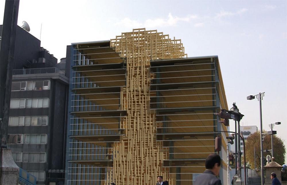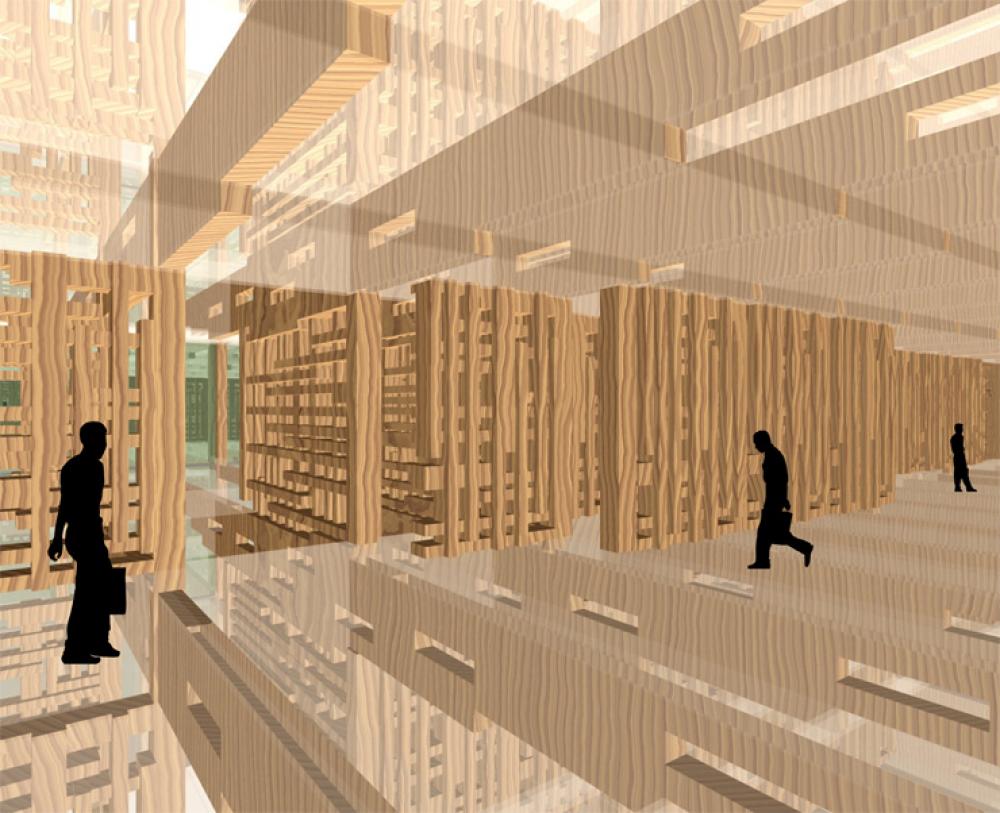 具体的には、木の立体格子がその中心(コアゾーン)を形成する。その場所は建物の構造の中心である、内部深い場所に光と風を送り込む環境空間である。テラスや光庭には緑が取り込まれ、そこで働く人々や訪れた人々の憩いの場所になる。一方、寄り添う建物は柱だけが配置されるためユニバーサルな機能性が実現される。