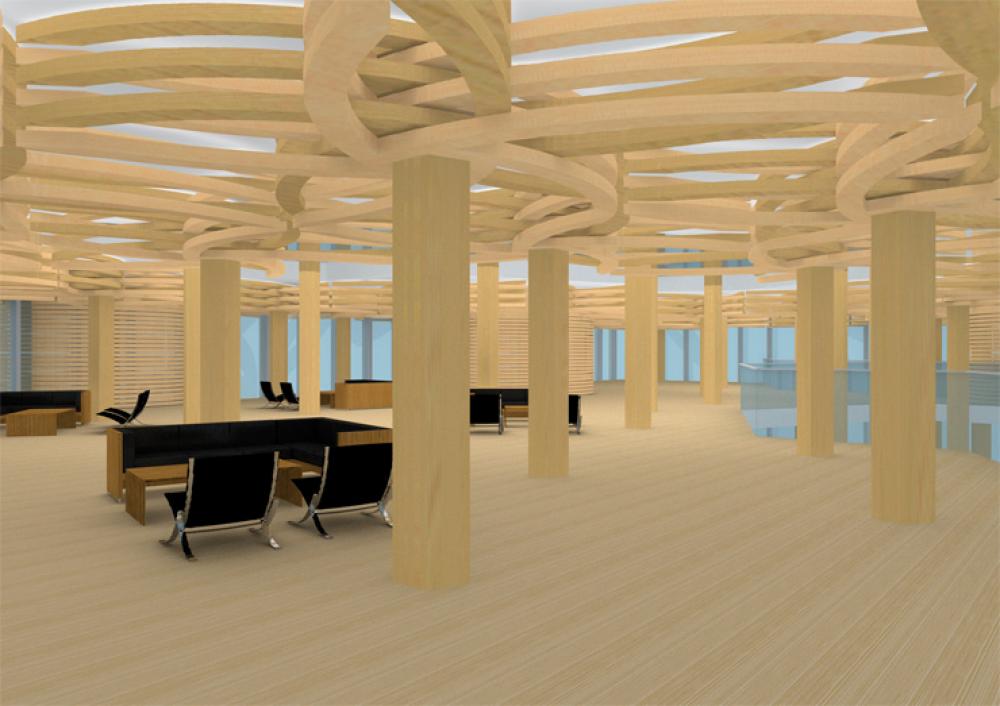 『都市木造』にふさわしい”新鮮な、かつ、木造ならでは”の魅力をどのように作り出していくか、この案では「木」という素材の<繊維の束のようなものであること><性能のばらつきを補う必要があること>の2つの特徴に着目しました。実用面では”欠点”や”扱いにくさ”に繋がる性質といえるかもしれません。が、そこにこそ「木」の魅力の素があるはずです。