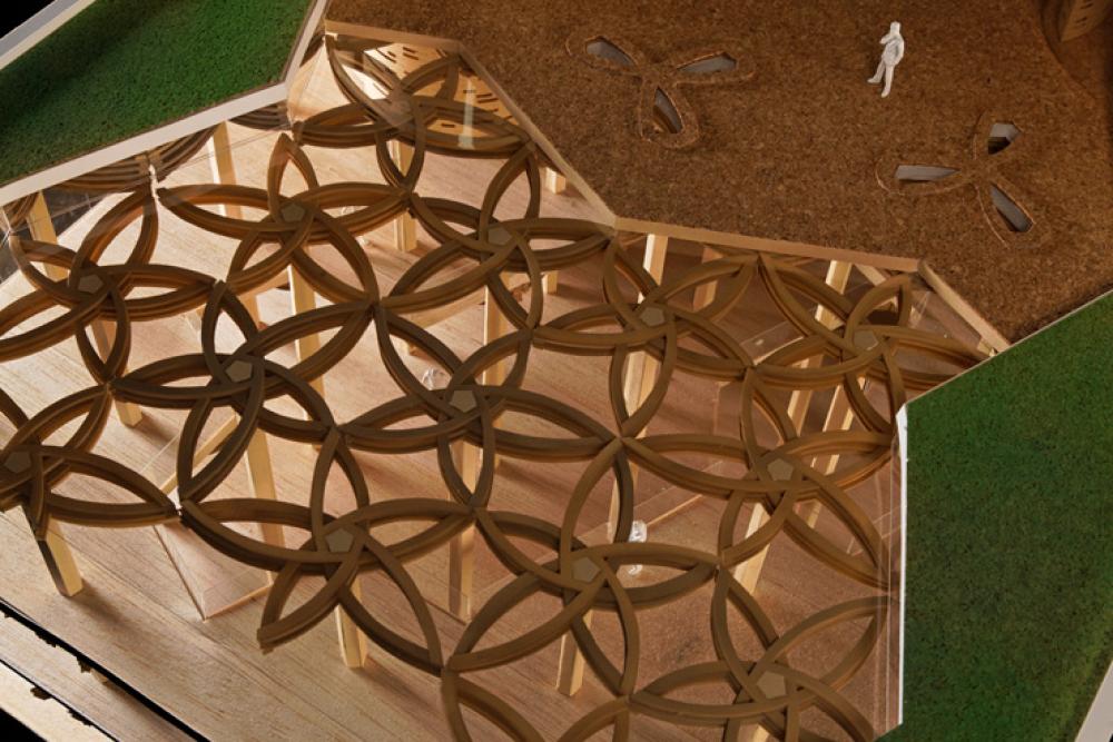 RCや鉄骨の、無駄の無い緊張感を持った構造美に対し、木の構造の美しさは、計算に基づきつつも個々の性能のばらつきを補うべく<ちょっと太め・多め>な中に見出したいと考え、ここでは小さい断面の部材をたくさん使う方法について検討しました。<ランダムではなく規則的><シンプルなのに単調に見えない>架構パターンとして、五角形グリッドに展開する2列3段の重ね透かし梁を提案しています。
