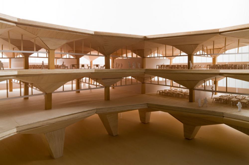 - 集成材の折板構造による木あらわし型耐火建築物 -