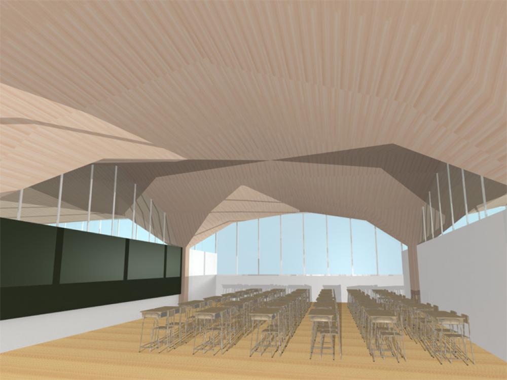 このように木のやわらかい天井で包みこむようにつくられた空間のまとまりがそのまま、教室の空間の基本単位となります。