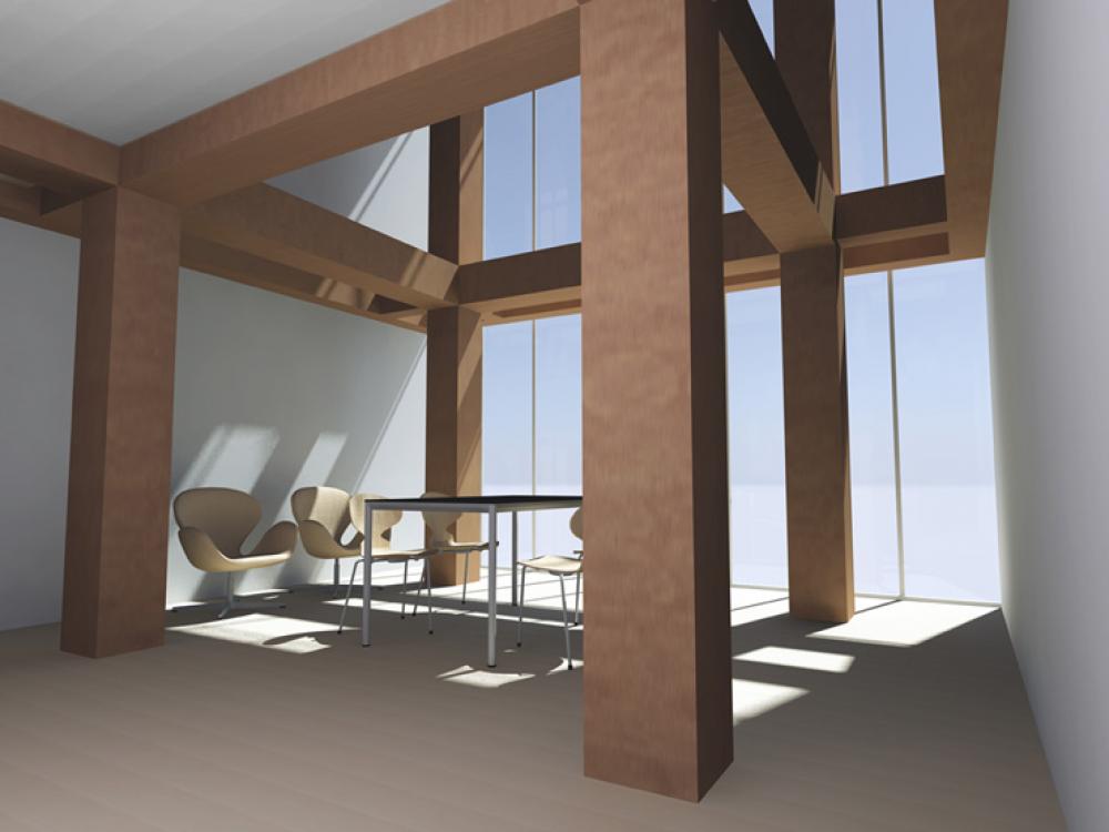都市における新しい木造建築「都市木造」には、木質耐火構造のスタンダードが必要である。要町Kビルでは、エムビルを踏まえて、4階建てのオフィスや共同住宅などに実際に展開できるような汎用性の高い木質耐火構造システムの開発を進めている。柱や梁、床、屋根などの主要構造部について、木質耐火仕様を検討し、新規耐火認定の取得を行なう。その際には、エムビルの実現プロセスで明らかになったように、部位相互の接合部における耐火性能等について、実験も含めた詳細な検証が必要である。