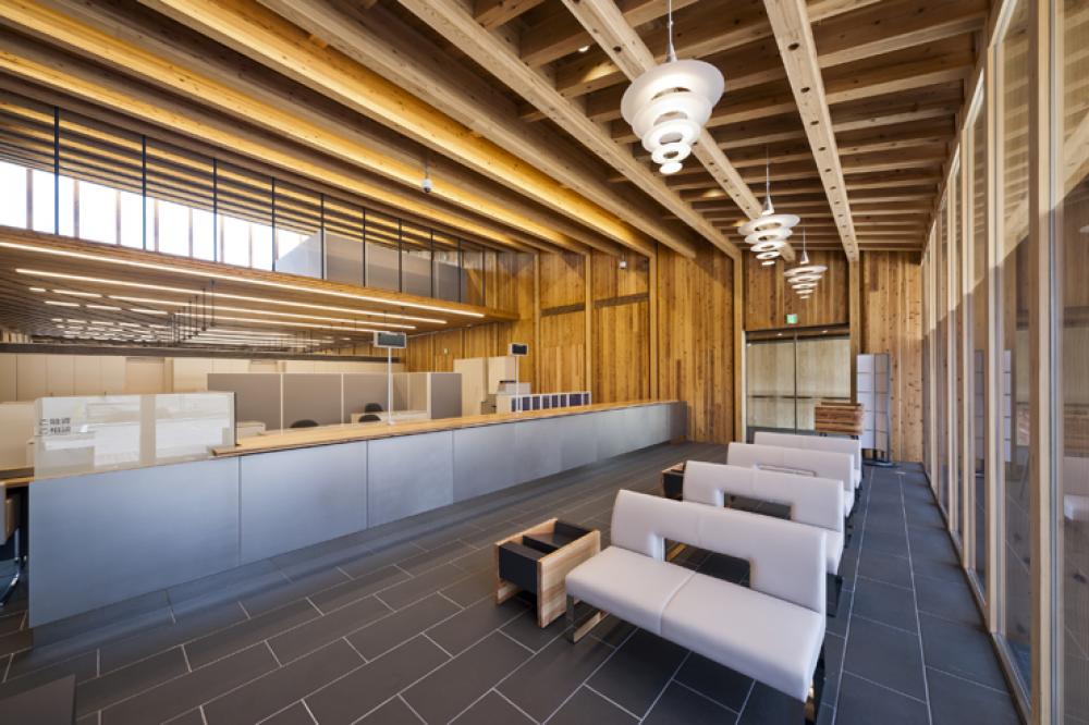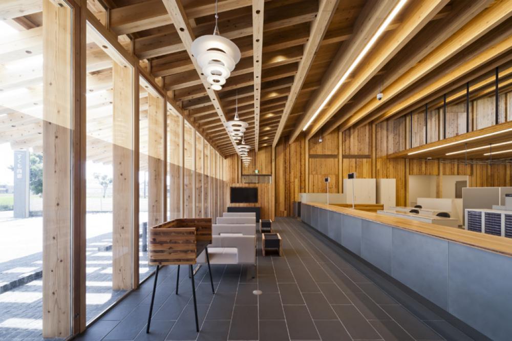 すくも商銀は、CLTを積極的に使用した日本で初めての銀行であること、また、CLTという素材を生かしながら、スチールの張弦梁と組み合わせるハイブリッドデザインや、輻射式床下冷暖房を組み込む工夫などが、シンプルな平面計画と大きな清々しい勾配屋根というベースデザインに、個性を付加している。この銀行を訪れる人は、「CLTだね!」というより、「素敵な木の銀行だね、しかもモダンだね!」などと言いそうで、伝統木造とは違った現代にふさわしい、一般の方にも訴求力のあるデザインとなっている。