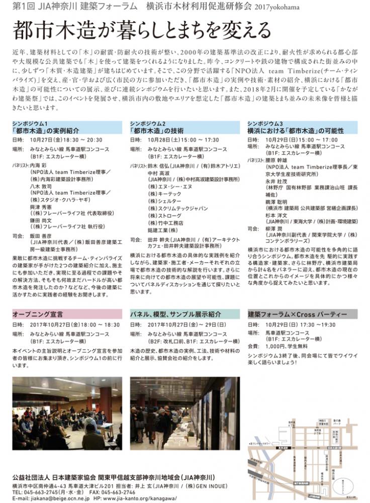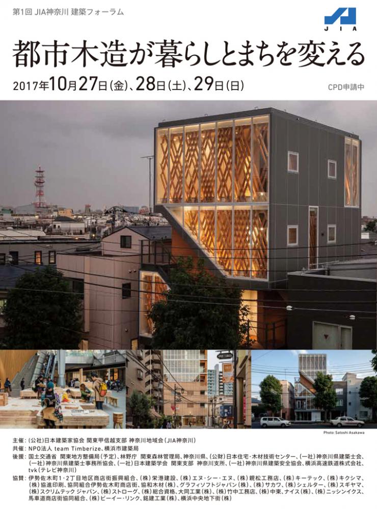 都市木造が暮らしとまちを変える 2017年 「都市木造が暮らしとまちを変える」 【 会期 】2017年10月27日(金)~ 2017年10月29日(日) 【 会場 】みなとみらい線 馬車道駅コンコース 【 入場料 】無料 【 主催 】(公社)日本建築家協会 関東甲信越支部 神奈川地域会 【 共催 】NPO法人 team Timberize、横浜市建築局
