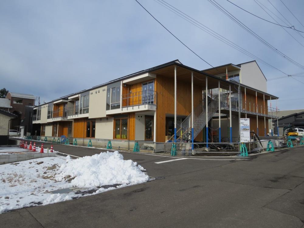糸魚川市へは、今取り組んでいる仕事で初めて訪れた。平成28年12月22日、市の駅北大火で約4ヘクタールが消失した。復興の象徴として、自力再建が困難な方に向けて市営住宅が建設されることとなり、スタジオ・クハラ・ヤギがプロポーザルで選定された。糸魚川市は、ヒスイとフォッサマグナが有名で自然豊かな日本海に面するまちである。産業としての林業は活発とは言えないが、全国の地域と同じように杉を中心とした製材業は存在する。今回の計画では、糸魚川産の杉を柱材、手摺のルーバー、外壁、厚板集成材のラミナに採用した。火に強い町なのに、木を使うの?と思われるかもしれないが、きちんと防火の規定を守った準耐火建築物である。駅北大火とともに「雁木」も多くが消失してしまったため、そうした雁木的なものを復活させる「軒空間」や「デッキ」もデザイン要素にしています。