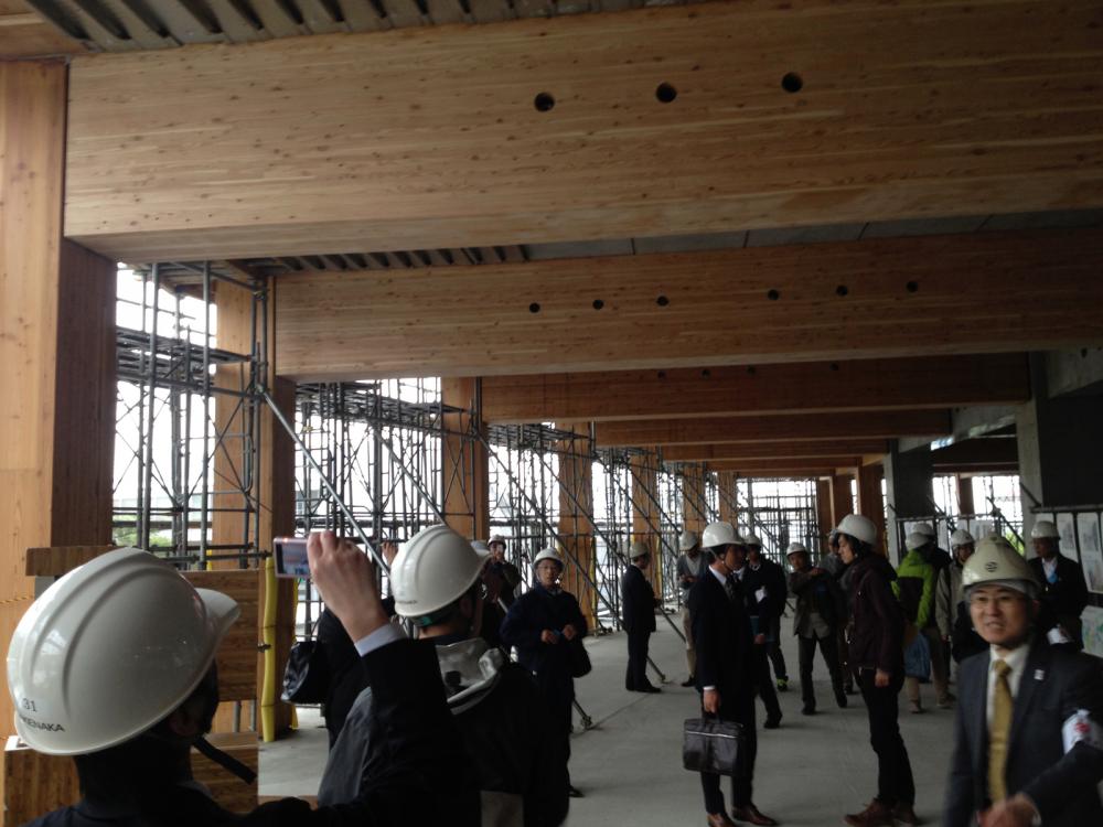 サウスウッドは国内初となる耐火木造の大型商業施設です。「燃エンウッド」という1時間耐火の燃えしろ被覆型耐火部材が2~4階の主架構(柱、梁)で採用されています。9メートルの柱スパンが実現された、先進性の高い耐火木造です。この度、NPO法人賛助会員の竹中工務店さんのご厚意で「サウスウッド」現場見学会が開催できることになりました。
