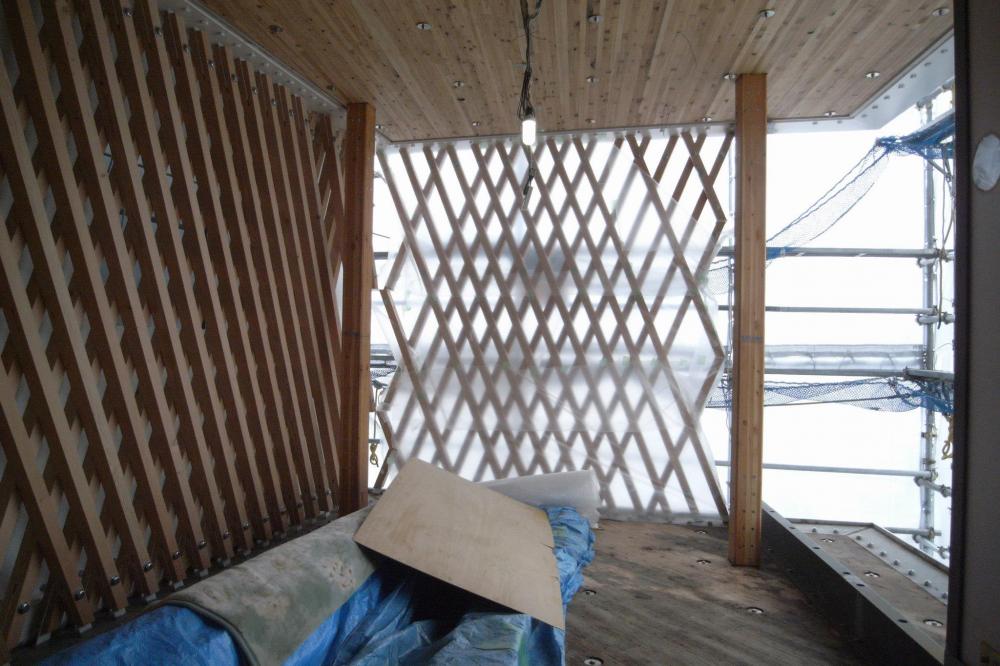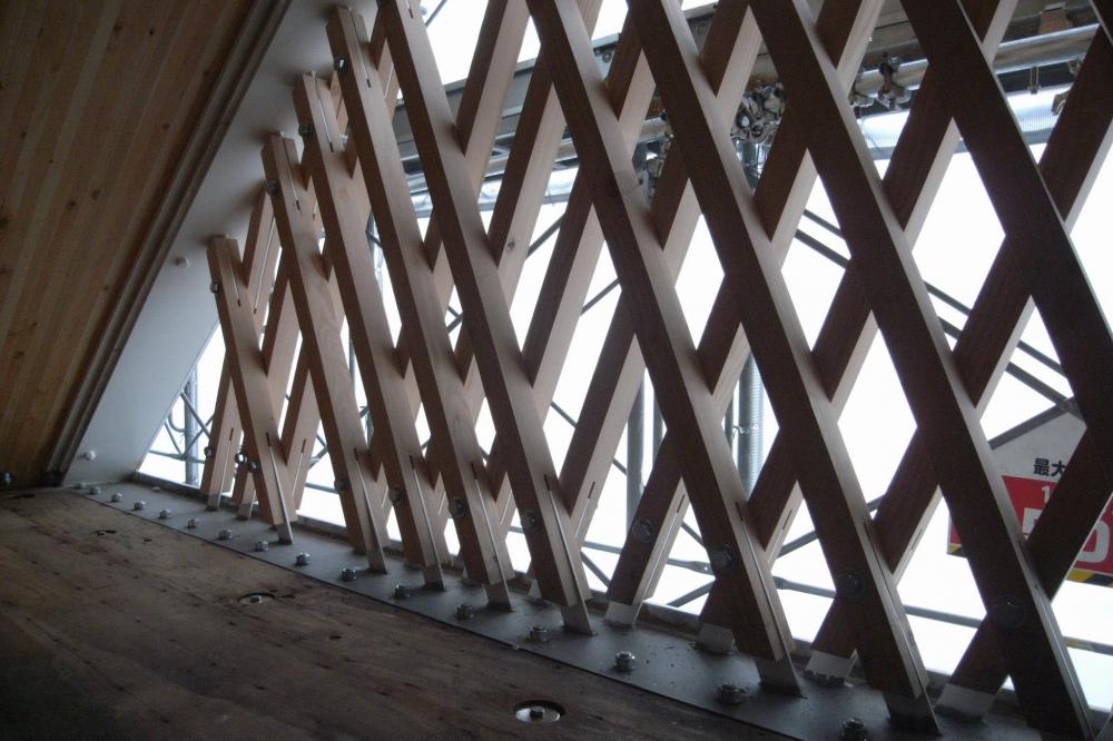 集成材の柱と厚いフラットスラブにより建物の鉛直力を支え、建物を覆う「木斜格子」が水平力を負担し居住空間を柔らかく包み込みます。