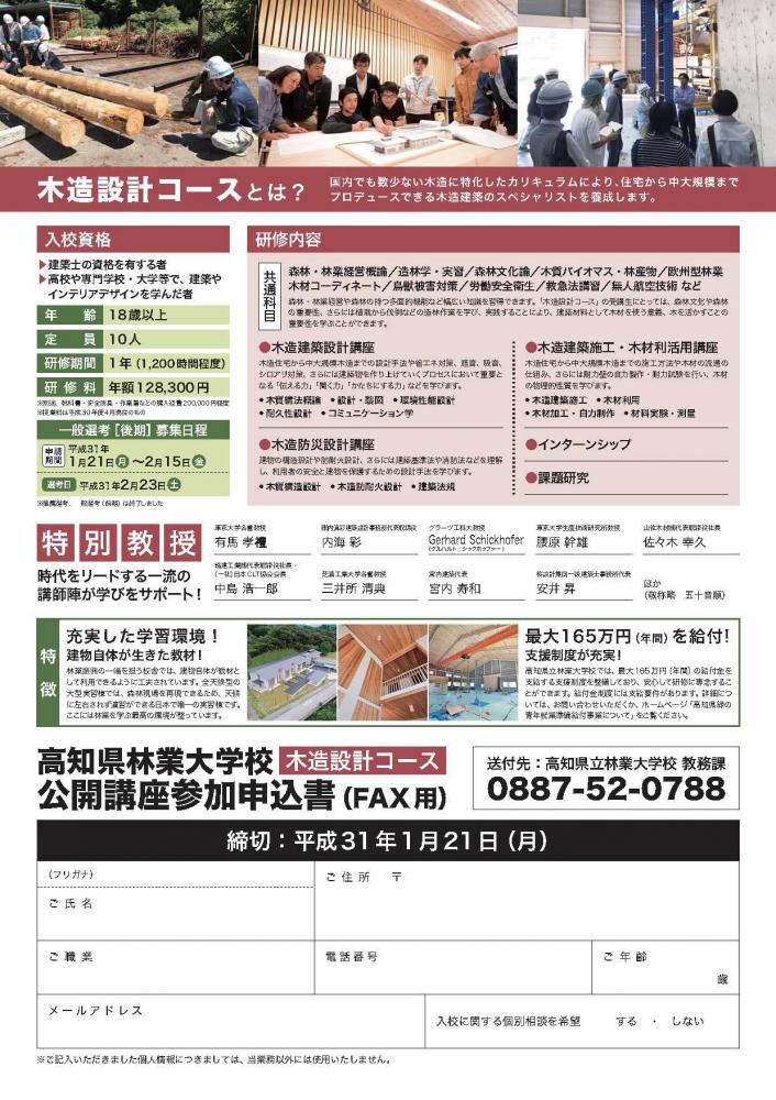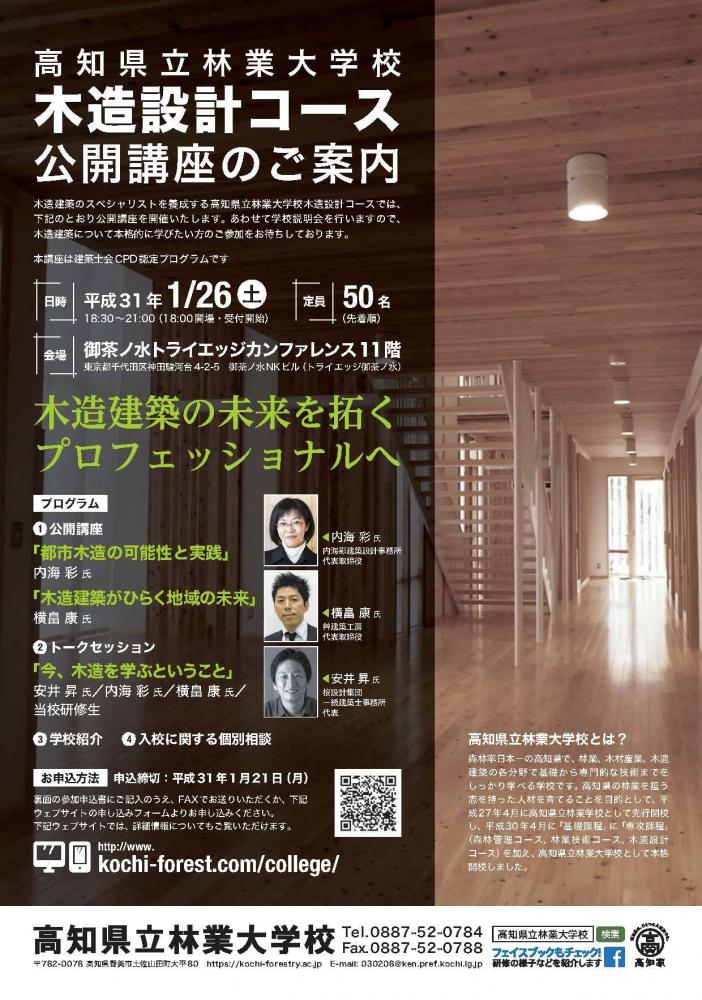 ティンバライズがカリキュラム作成をご協力させていただいている「高知県立林業大学校木造建築コース(校長:隈研吾さん)」公開講座が、来年1月26日(土)18:30より東京・お茶の水にて開催されます。理事の内海、安井も登壇し木造建築のおもしろさ・楽しさ・ちょっとしんどさなどを語ります。