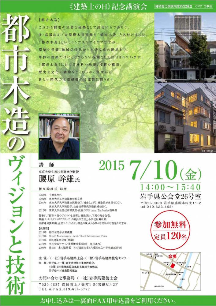 都市木造のヴィジョンと技術 2015年 盛岡で、最近の都市木造の状況についてお話します。 <建築士の日>記念講演会 「都市木造のヴィジョンと技術」 日時:2015年7月10日(金)14:00-15:40 場所:岩手県公会堂 26号室 主催:岩手県建築士会、岩手県建築住宅センター
