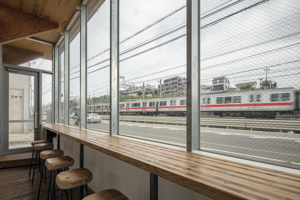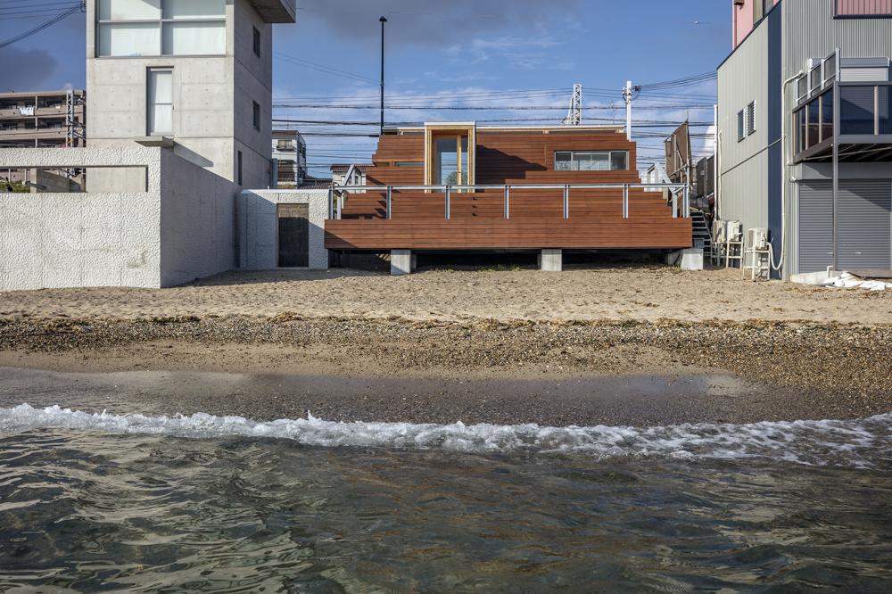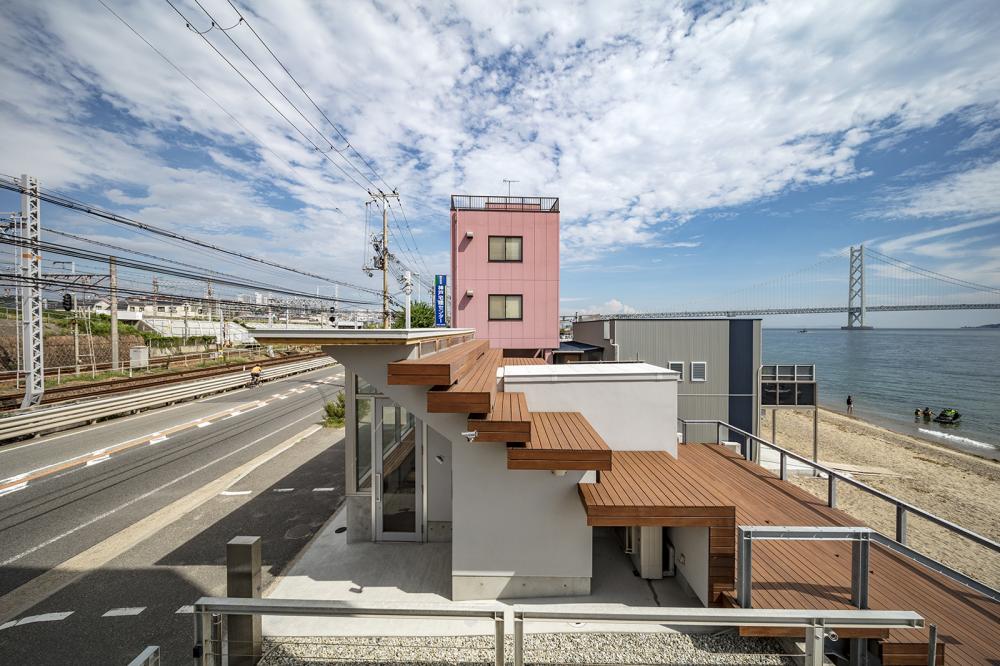 明石海峡大橋と淡路島をのぞむ、舞子海岸沿いの小さなカフェである。堤防をまたいで国道と海岸に面する小さな敷地に、階段状のテラスがそのままの段々屋根となっていく、スタジアムの観客席のような建物を計画した。このプロジェクトは、実験廃材のCLTパネルを有効活用すべく始まり、建物と家具に用いられているCLTの大部分は再利用材である。