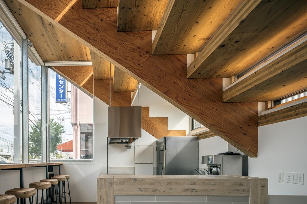海を眺める階段テラスの裏側にカフェのキッチンとカウンター席がある。階段状の屋根は、150厚LVL大判パネルから切り出したささら桁状のレイカービームに、150厚CLT(直交集成板)を段板のように載せて構成している。CLTは、ルーバーのような役割を果たし、日中は直射日光を遮り、室内の温度変化を抑える。夜は店内の灯りがスリットからもれ出す。