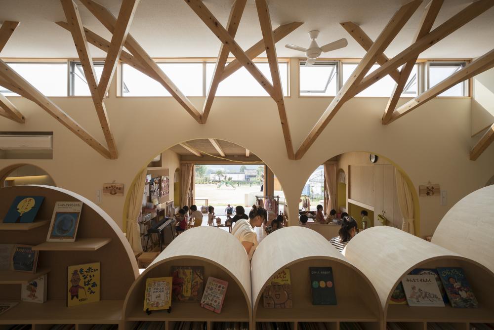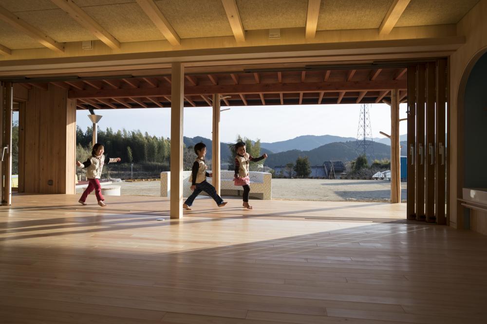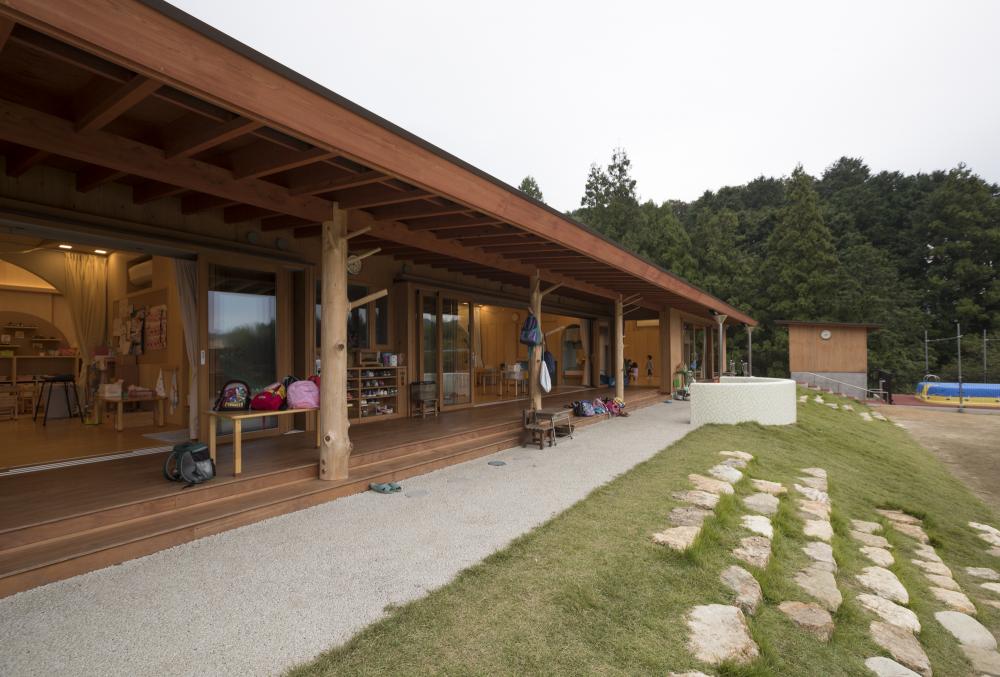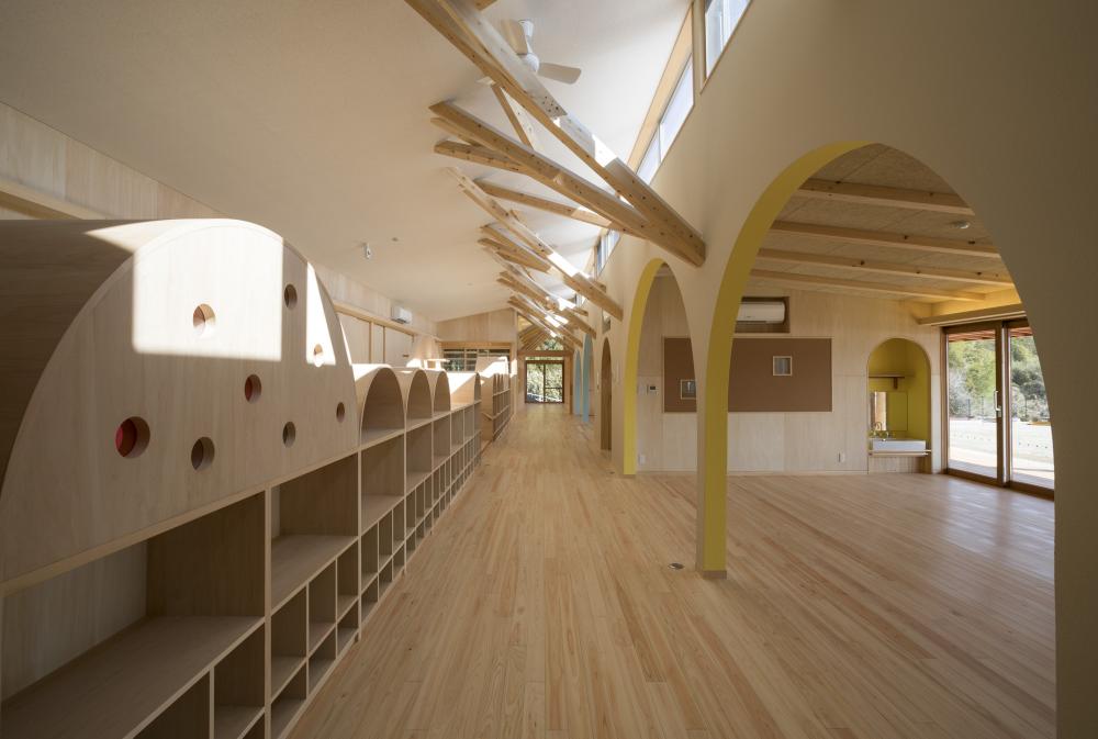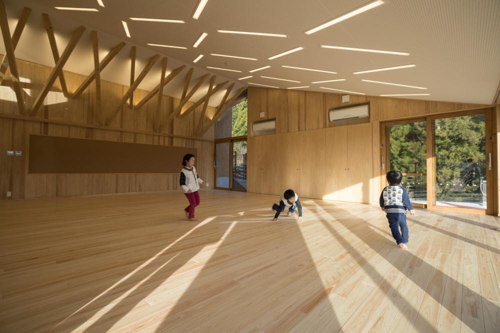 縁側―保育室―共有スペースと、構造材の見せ方や仕上材、色、光の入れ方をレイヤー状に変化させて、奥へ行くほど明るく、子どもの心を浮き立たせるような構成とし、子どもたちがその中で様々な空間や視点を発見し遊びを生み出すような園舎を目指した。町産材利用を検討する中で、新園舎から見える山の木で縁側の柱を作ることとなり、子どもたちも枝払いや、やすり掛けを体験した。子どもにとって、環境・体験・他者との出会いの全てが成長の糧であり、園舎の建設過程もその一つにしていこう、という地域の皆の思いから実現した丸太柱が、新しい保育所の顔となっている。