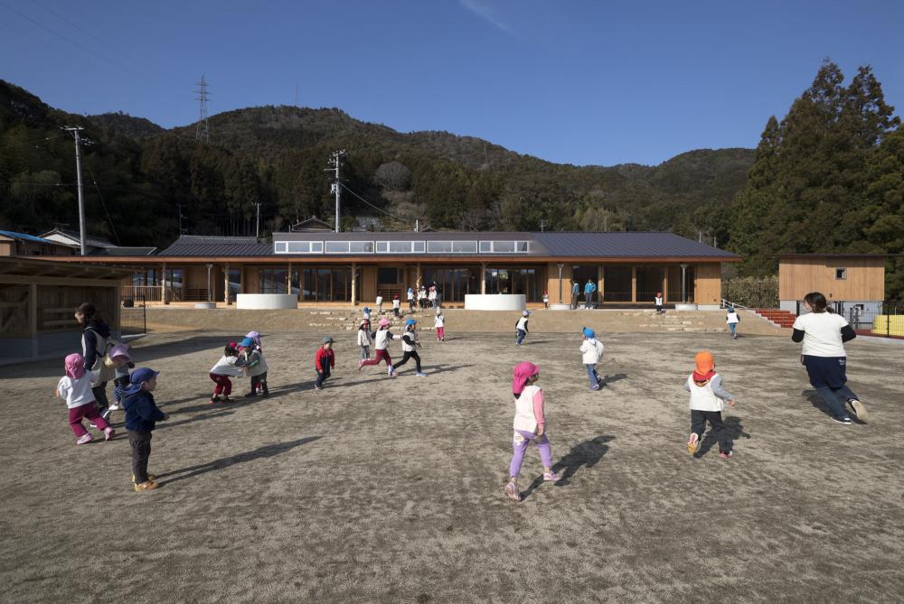昭和28年創立の町立保育所の新園舎である。敷地は川沿いの低地から山へ登っていく道の途中にあり、南に眺望がひらけている。そこで、造成を最小限にとどめ敷地の高低差を活かし、山側の民家の眺望も損なうことなく十分な気積を確保し、皆で見晴らしを楽しめる場を作りたいと考えた。