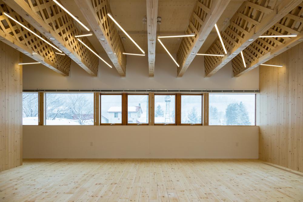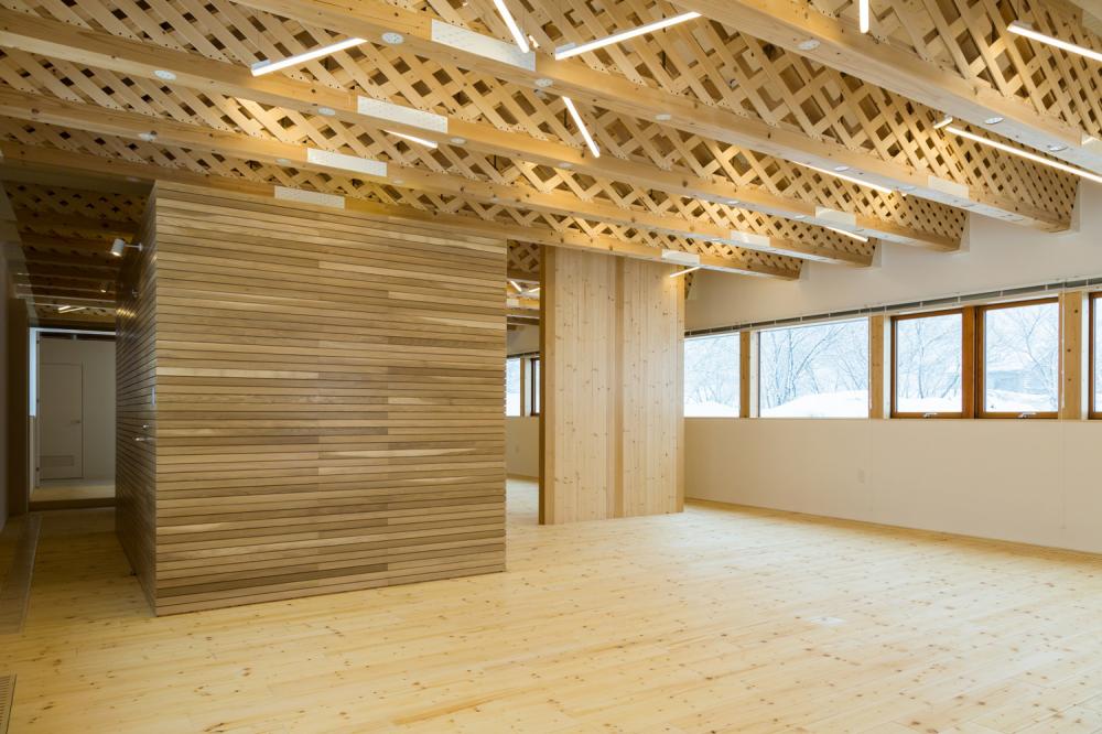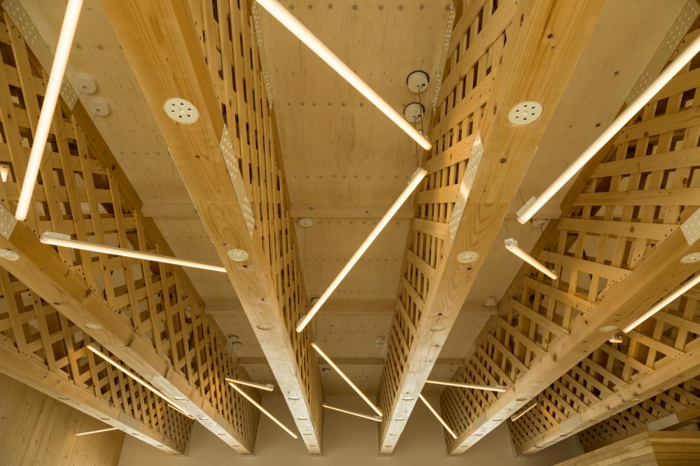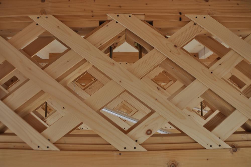 トラス・ラティス梁は、一般に流通するサイズの製材による組立て梁で、トドマツでも乾燥が容易な厚さ9mm 幅 70mm のラティス材を、構造的な合理性と意匠性を兼ね、端部は密に中央は粗に配置している。また、下川町は多雪地域のため安全に配慮し、内側にトラス材も入れている。計算だけでは追えない部分もあるため実験を行ない、必要十分な耐力を確認し、ラティス材がトラスに劣らない粘り強さを発揮することも確認できた。