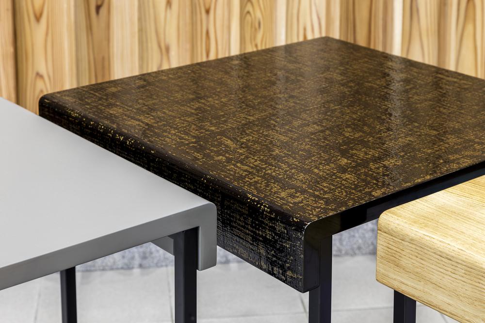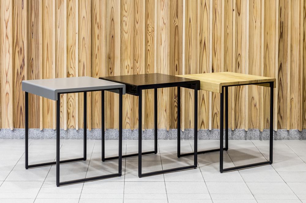 EC-01、EC-02は秋田の萩原製作所と共同して曲げ合板の成型限界に挑戦し試行錯誤の上実現した椅子である。合板の表面材はブナ。腰かけると合板が適度にしなることで心地良い座り心地を生み出す。テーブル類は、天然秋田杉、秋田産広葉樹といった木のオイル仕上げ天板だけでなく、漆器の産地として名高い秋田県川連地域の職人による漆塗り天板も使用している。
