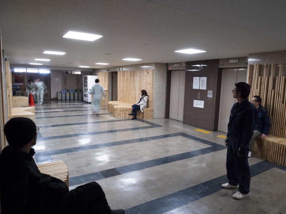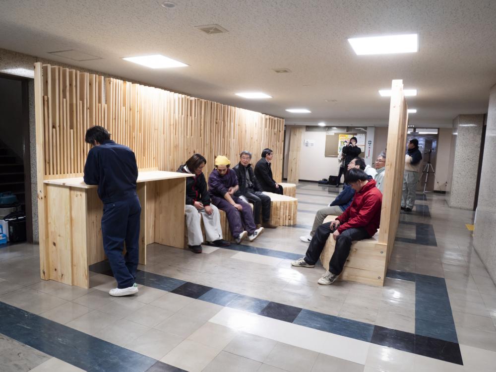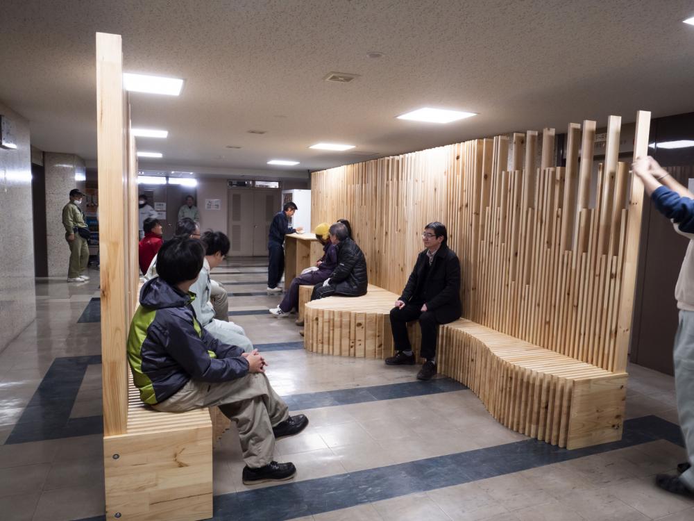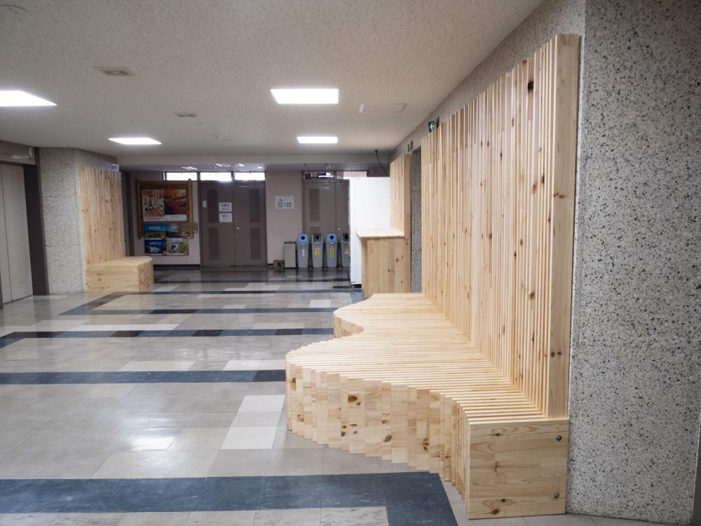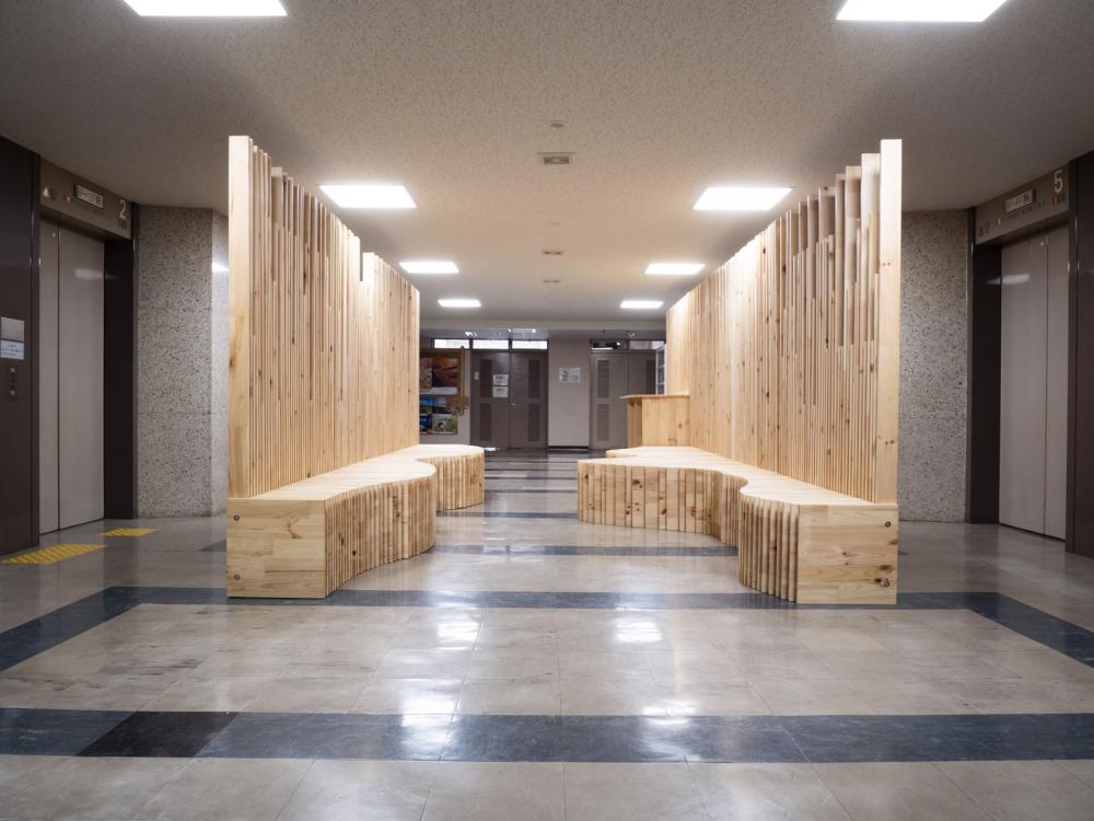 市街地木質化の可能性を検討するために岩手県が平成28年度に設置された「パブリックスペース等木質化検討委員会」は3年間にわたり県内の様々な角度から市街地木質化の可能性を検討してきた。その3年間の活動の節目として、実証モデルを設置しようというプロジェクトである。エレベータ待ちのスペースでしかなかった岩手県庁6階エレベーターホールを、木製家具により新しいアクティビティーが生み出そうという試みでもある。この木質化実証実験は、「パブリックスペース等木質化検討委員会」が中心となり、県と県内林業・木材産業関係団体の皆さまとの協働により、県産アカマツ材を使用した大型木製家具「Slit-bench」を製作・設置した。