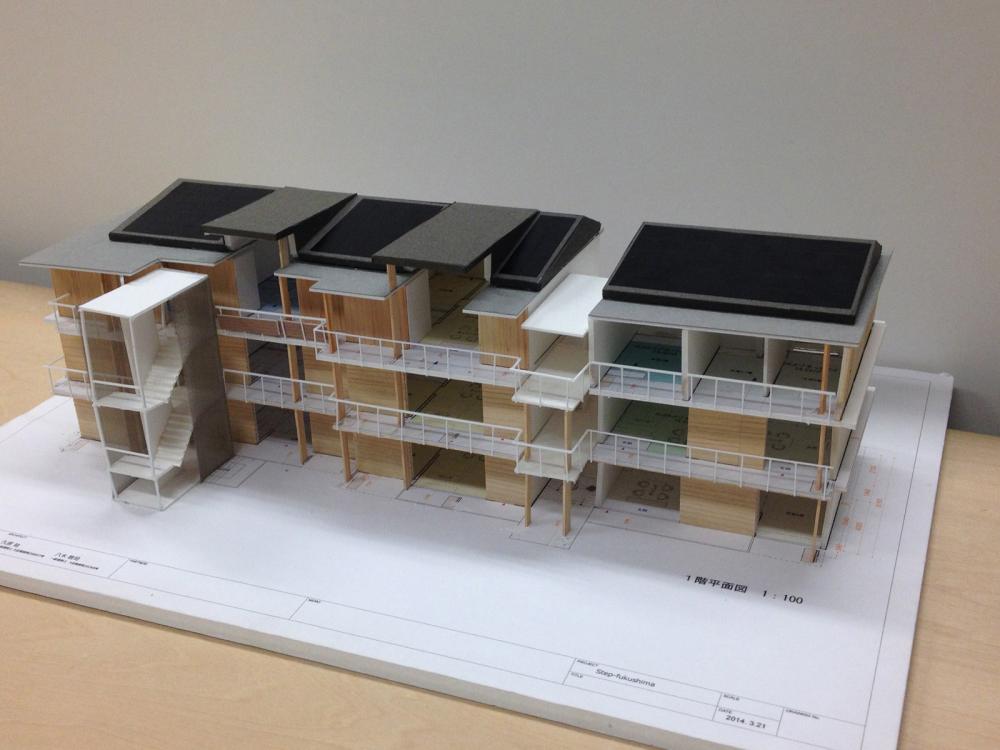 福島県での木造復興公営住宅実現のためのモデルづくり。3階建ての共同住宅棟と2階建てのテラスハウス(長屋)を計画。