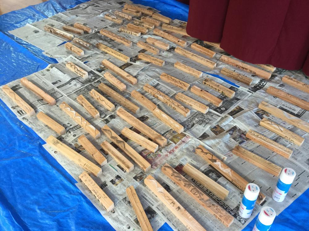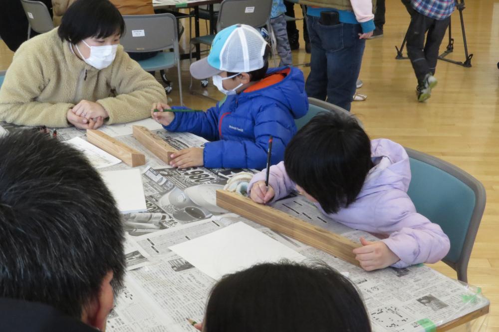 市民参加のワークショップで、手すりのルーバーに使用した木棒の端材に、市民の皆さんに木炭鉛筆で絵を描いてもらいました。160本の木棒を駅北復興住宅の小路の壁面に飾ることで、市民に親しまれる住宅になってくれればと思っています。