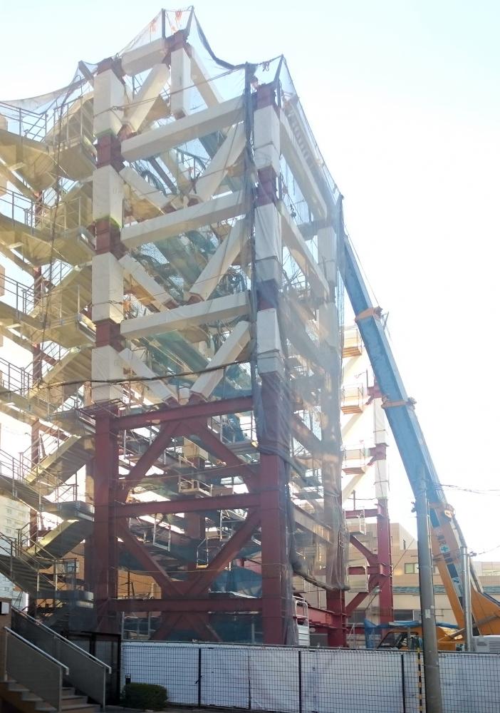 構造フレーム(白シートで養生されているのが木質HB集成材)