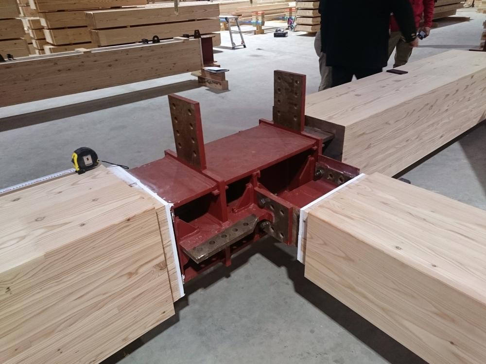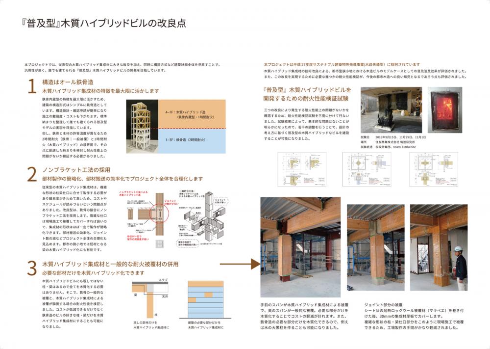 木質ハイブリッド集成材は鋼材を内蔵した集成材で、2004・05年に「柱」「はり」で一時間耐火大臣認定を取得していた。これをコストや工期、設計上の要請などの面から見直し、耐火性能検証試験でその性能を確認したのがノンブラケット型の木質ハイブリッド集成材である。都市木造が徐々に広がりつつある中で、既存の技術を改良し、不足している点を補いながら、より汎用性のある使いやすい部材にしていく「普及型の開発」に取り組んだ例である。