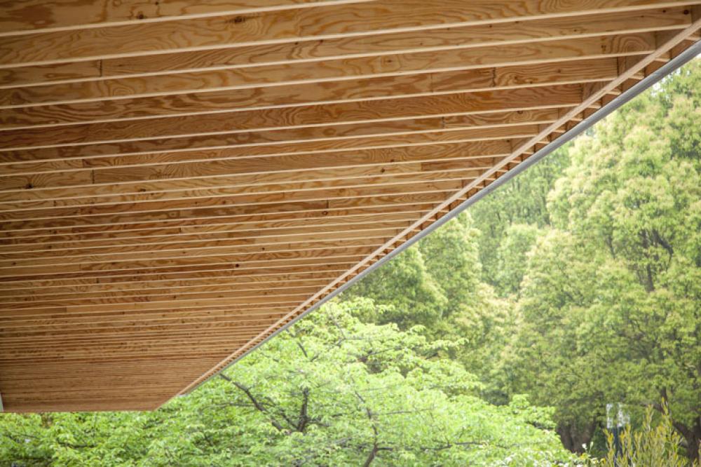 長方形の単純な平面に列状ながら一見不規則に並べられた柱、あえて空間の中央に配置された柱。壁ではなく柱が空間を不明瞭に分割する。列柱が、屋根架構に潜む明確な構造システムを暗示させている。壁・桁などの線で支持する場合には、梁は1方向(ワンウェイ)のシステムが採用されやすいが、点の柱で支持する空間では、2方向(ツーウェイ)で活用するのが自然である。さらに平面の直交座標系に対して角度を振ることによって出隅部分の軒の処理を合理的にしている。構造的には、単位面積あたりの屋根荷重から必要な梁の本数が算出可能でその配置リズムは自由になり、ここでは「1/fゆらぎ」のリズムで並べることができる。重ね格子梁では構造せいが大きくなりがちであるが、天井懐空間の遮音、振動防止、防火、設備活用などと合わせて工夫ができれば、この単純な構造システムの組み合わせによる単位空間の構成は、都市木造に求められる多層構造にも生かしやすい。
