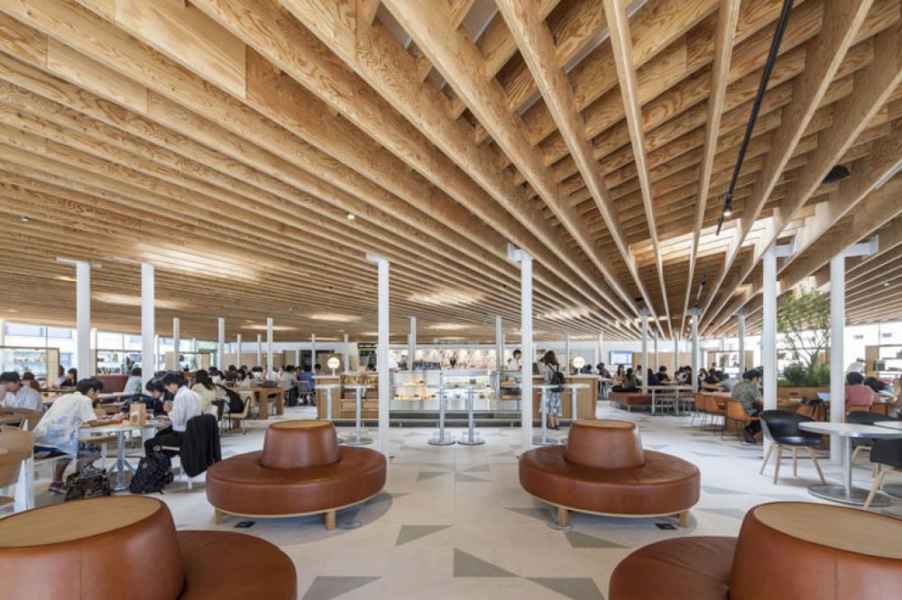 この建築は、規模に対して天井が低く設定されている、が、架構の奥行きは深い。そして、架構は一見秩序だって見えてゆらぎを導入した配列だと言う。ここに、ふたつの伝統的な木造建築の特徴が見られる。ただし、勾配屋根の軒を低く抑える、立体格子や並列された梁で奥行き感をつくる、という従来の方法をスマートに現代風に仕立て直している。架構は水平でありつつ天井は低い。格子は荒めの素材感を編み込んだような繊細かつ素朴な架構。木造デザインのエッセンスをしっかり受け止めながらも、現代人にとって新鮮に感じる建築としてデザインされている。