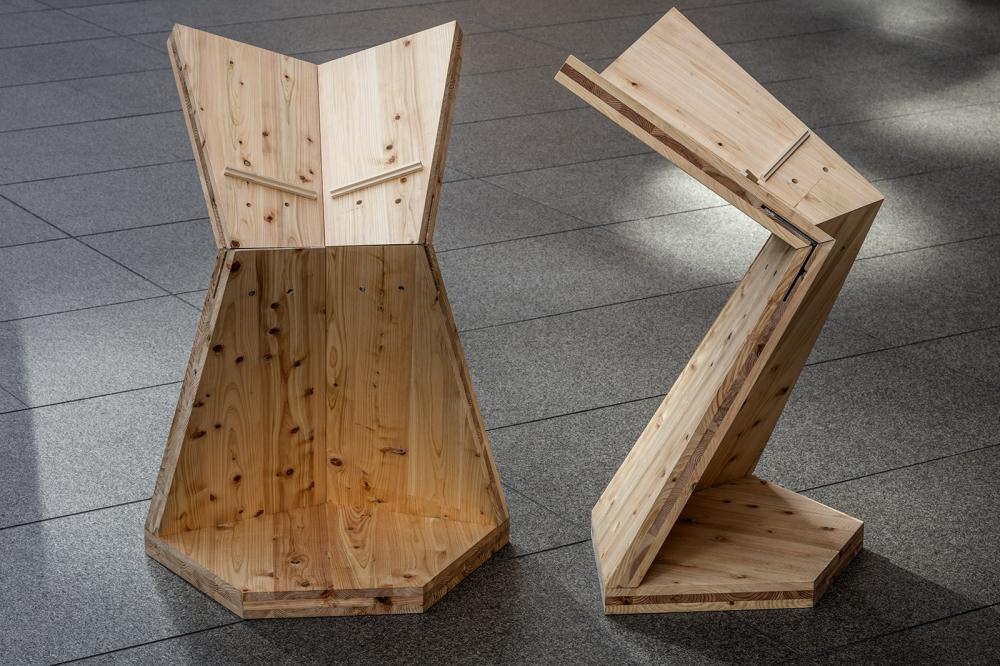 折り曲げたCLT板だけで作られた見台(ブックスタンド)で、ディスプレイなどにも使えます。 折り紙 の原理を用いた「折版構造」とし、CLTの厚板が自立する不思議なかたちが可能になりました。
