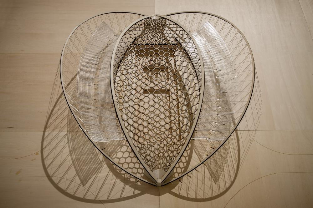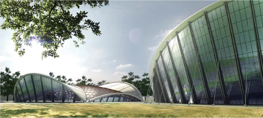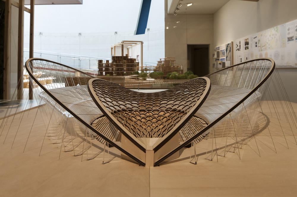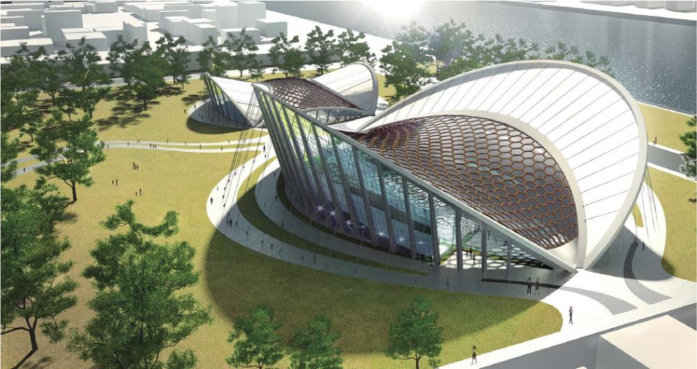 曙運河に面した、広大な緑地を有した辰巳の森公園に水泳場と水球場の2施設を計画した。木造カテナリーハニカムとインナーフレームにより200m を超える大スパンを構成している。合理性を考慮し主要なインナー/アウトフレームなどの主要な構造要素は鉄骨とした。屋根は木造カテナリーハニカムである運搬を考慮した寸法の三又状集成材を工場制作し、現場ではPC 鋼棒により緊結する。カテナリーであり引張力が主体であるため、ハニカム厚600mm を想定している。
