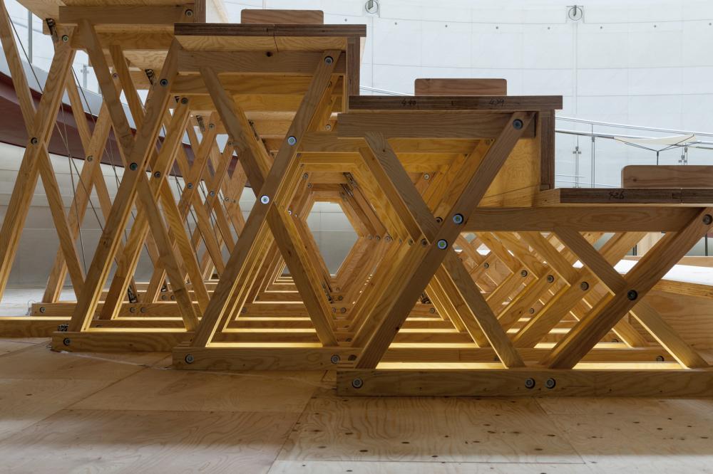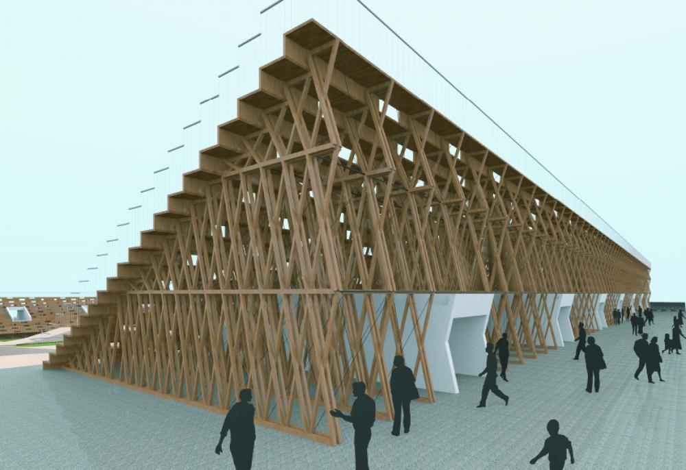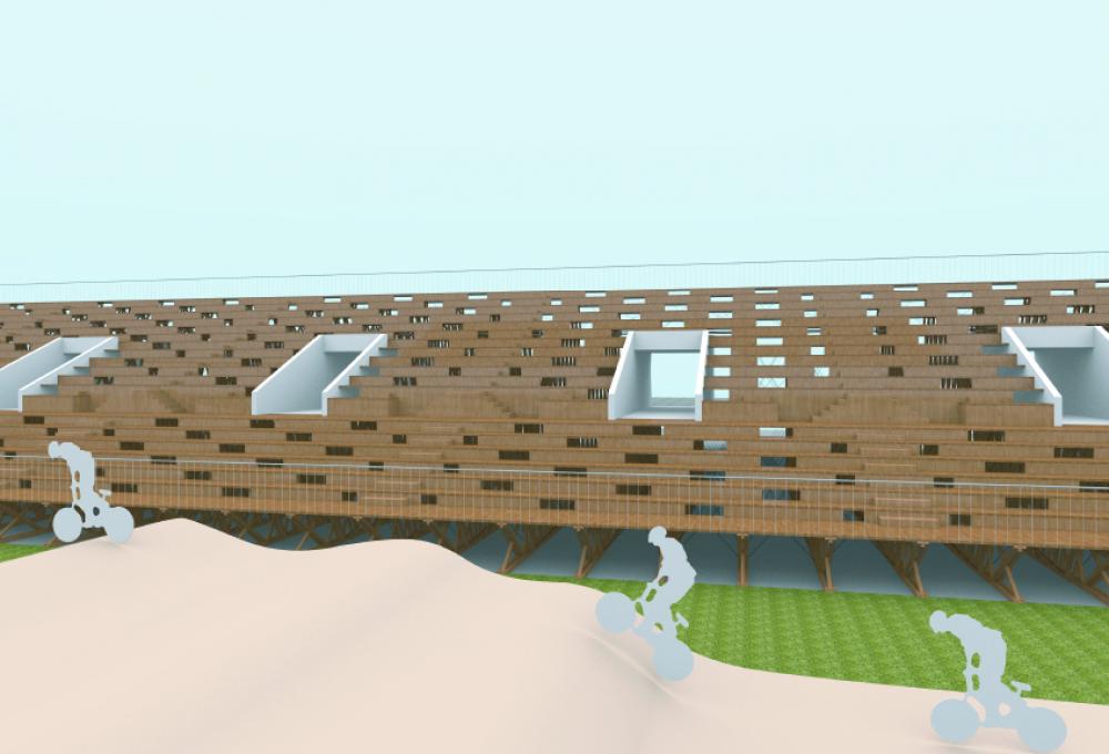 LVLを使ったBMX競技場仮設スタンドの提案です。組立および解体には簡易さが求められるため、支柱と繋ぎが一体となった『又』の字状の支持フレームを考案しました。このフレームは折りたたみ式で、1ユニットあたりの重量も30kg程度であり、運搬・搬出入や組立・解体も容易に出来ます。
