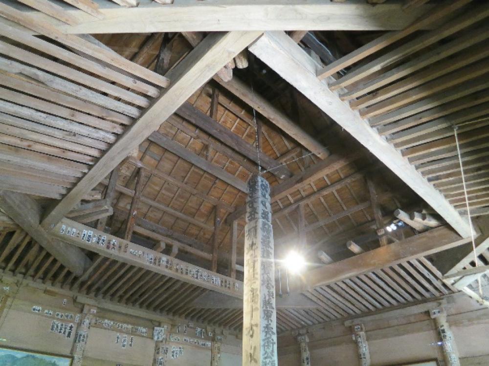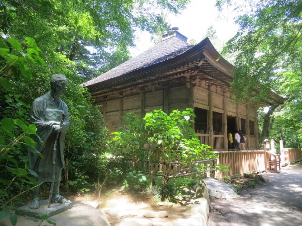 しかしながらそれを覆う御堂はRCでつくられておりやや興ざめであった。金色堂を後にしてしばらく行くと芭蕉の像の向こうに木造の御堂が見えてくる。RC造の覆堂がつくられる前の覆堂とのことである。こうした覆堂は金色堂保護のために鎌倉時代からつくられたという。内部に入り見上げて驚いた。四隅に架けられた梁に中央のボイド。その構成が地蔵堂にとても似ている。いや、地蔵堂が似ているのだが。設計した木の空間が鎌倉時代とつながったような気がしてすこし嬉しかった。
