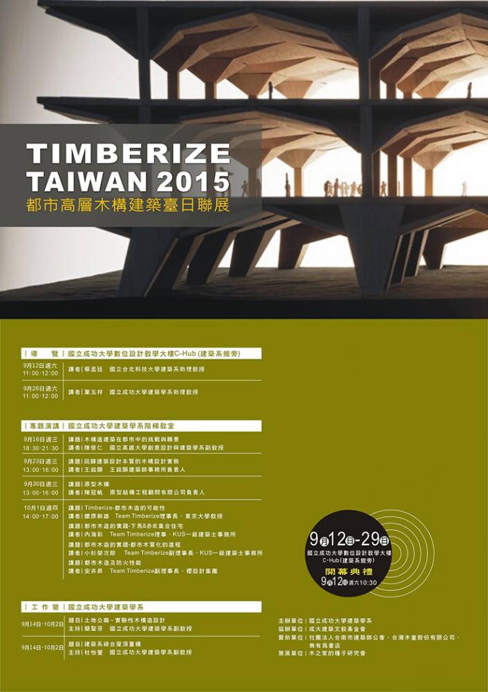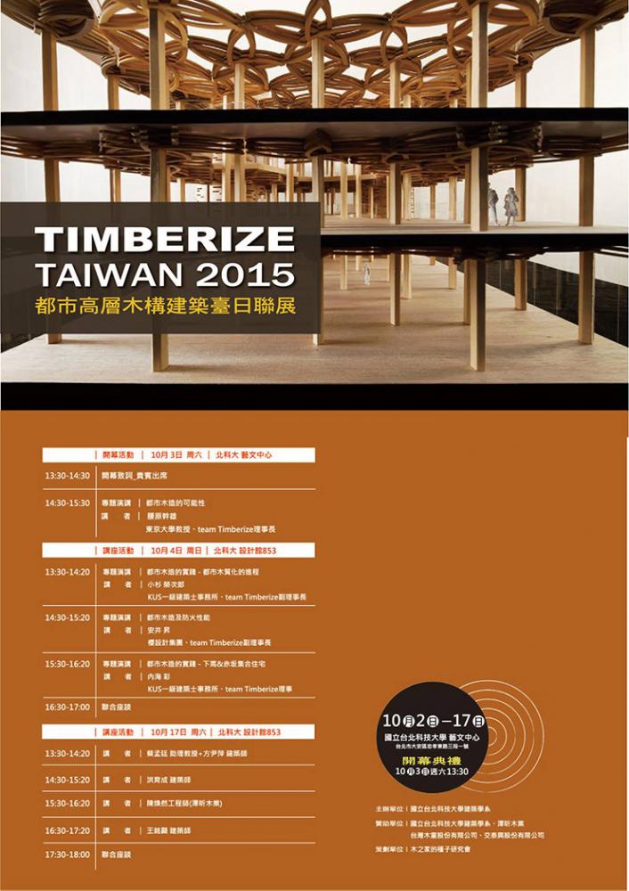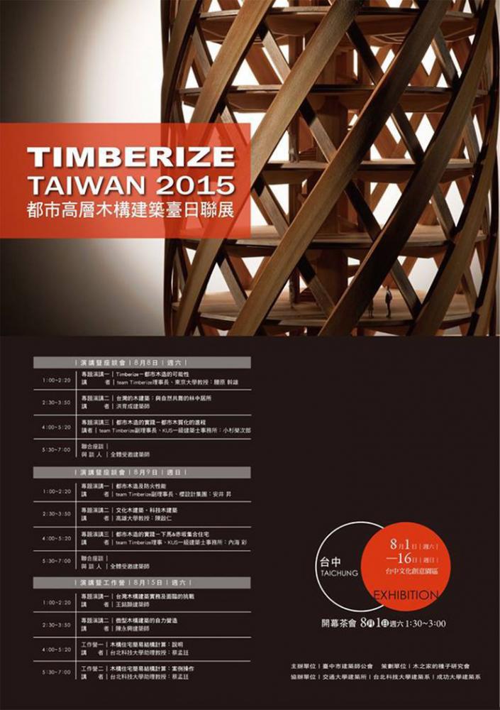 TIMBERIZE TAIWAN 2015 2015年 <展覧会概要> 【展覧会】 8月1日~16日 台中展 於:台中文化産業園区 雅堂館 C館 9月12日~28日 台南展 於:台南成功大学 10月2日~18日 台北展 於:台北台湾科技大学/台北科技大学 【シンポジウム】 8月8、9日 シンポジウム台中 10月1、2日 シンポジウム台南 10月3、4日 シンポジウム台北