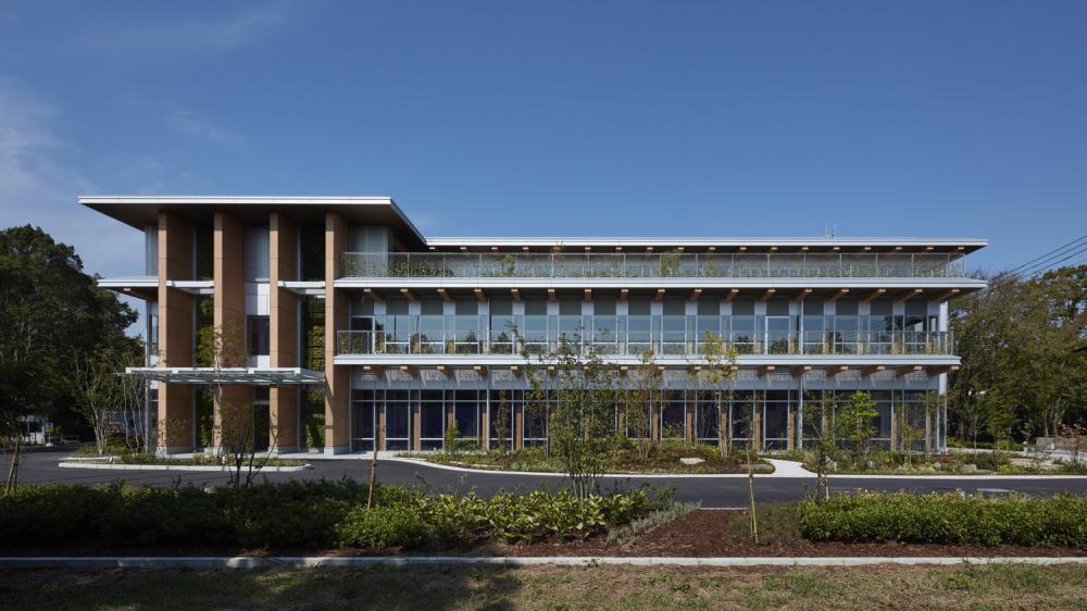 住友林業筑波研究所新研究棟では、3層吹き抜けのインナーコートヤードにLVLの市松状ブロック耐力壁を採用することで、開放性と耐震性を両立している。LVLの市松状ブロック耐力壁はポストテンションを用いることで接合部を簡素化し、加工性や施工性を向上させている。