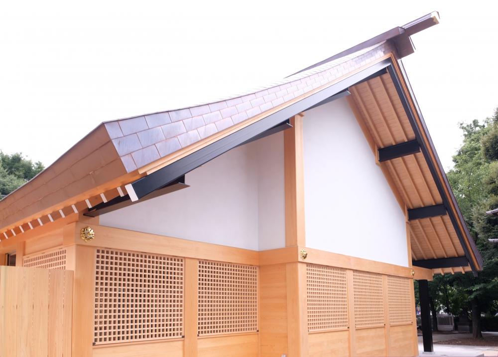 現代ではコンクリート造も含めて木造以外の構造で御社殿をつくることはそれほど珍しいことではなく、今回、大断面の白木を手に入れることの時間的制約や性能的側面から、拝殿の構造は鉄骨造が選択されている。そこには、古代からの形式を踏襲した木造でなければならない、構造から木で作られなければ本質的ではない、といった考えはない。先述したような長い時間をかけて形象化されてきた空間形態の質を大切にしながら、時代ごとの出来事に形を変えつつ適応していくような在り方を探っていった。そのように考えると、鉄骨造であることを隠す必要はない。鉄骨柱や梁は露出させて、一方で、祭祀のためのスペースについては、神具との関係などを考慮して尺貫寸法を採用し木材で仕上げた。鉄骨梁によって幣殿側の屋根は1間の張り出しによる軒ができ、また、拝殿側面の立面において柱が屋根まで到達していないことや、鉄骨のダイアフラムをよけながら木で仕上げることで生まれる柱梁接合部の組み合わせ、など木造の構法からは生まれない新しい表現がでてくることとなった。