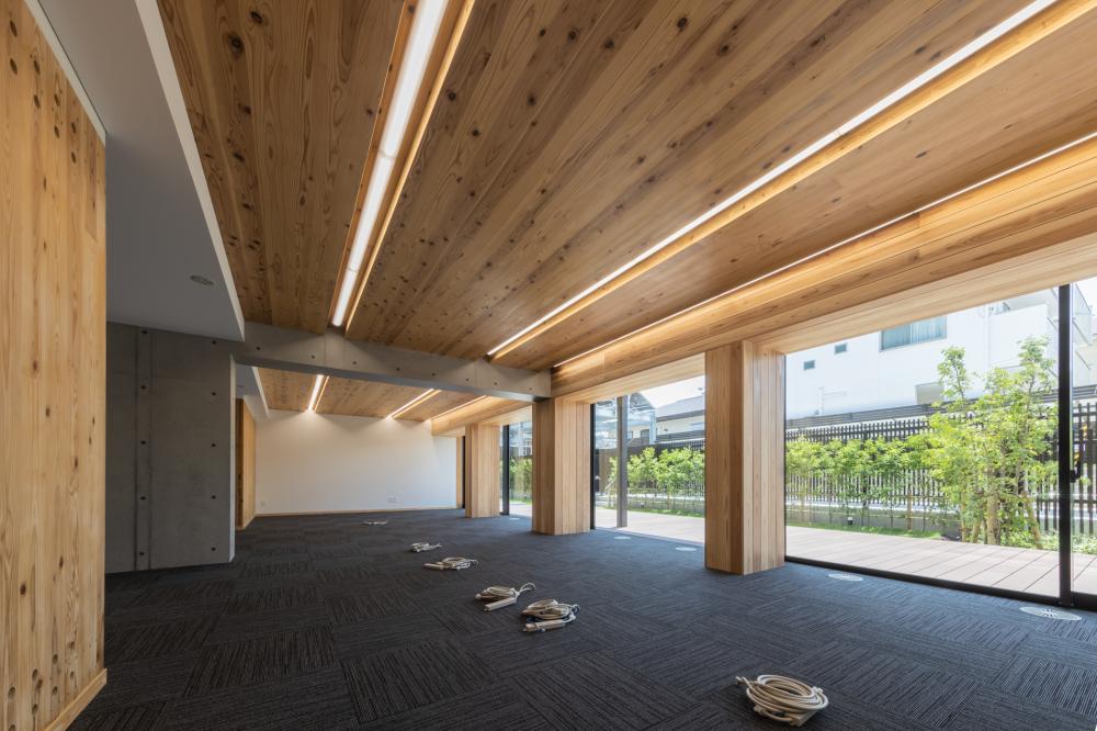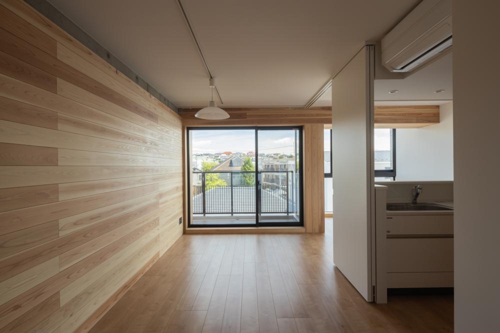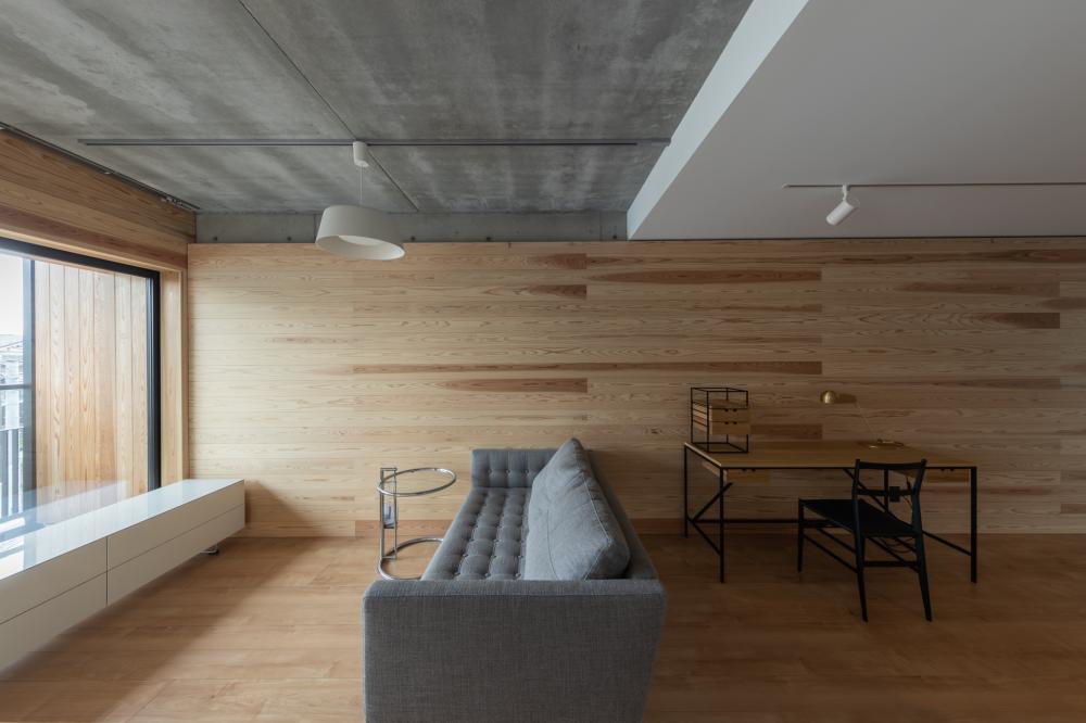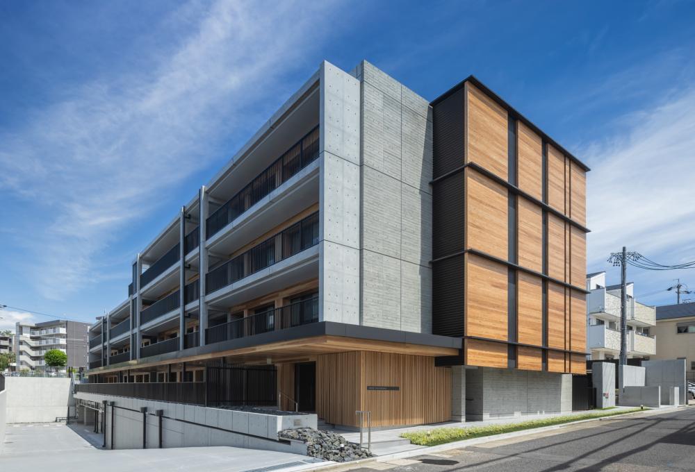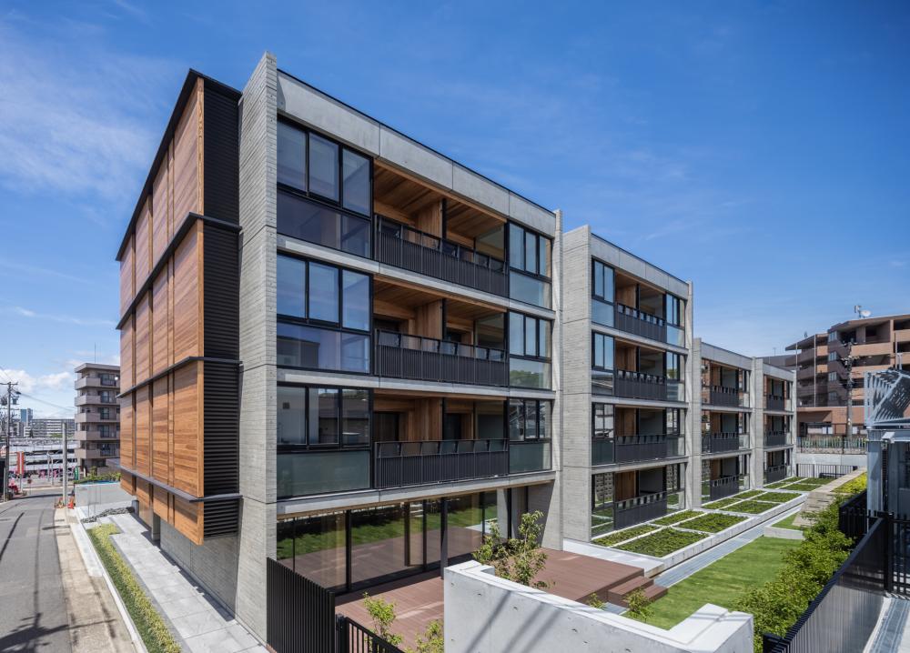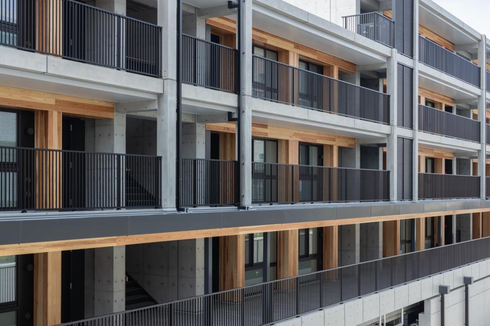 社宅の建て替え計画。公営住宅など4、5階建ての集合住宅はこれまでRC造では最も普通に建てられてきた建物のひとつである。現在、この規模の集合住宅でも木造で実現できるようになったが、RC造がメインで木造未経験の建築関係者にはまだまだハードルが高い。この建物では、すべてを木造ということではなく、RC造と木造の特性を活かしたハイブリッド建築として実現している。RC造の耐震壁に挟まれる形で耐火木造の柱梁フレームとCLT耐震壁による構造形式は、構造計画としてわかりやすいだけでなく、居住空間に木材を多用することができる。また、木質柱梁フレームで課題の大きいパネルゾーンにもコンクリートを用いることで構造システムを明快にしている。木材の意匠性や構造特性を活かしやすく、木材を使用しやすい部位にのみ積極的に木材を用いる割り切りを高く評価したい。今後、RC造に慣れた地方の中小ゼネコンが都市木造に参入する際の参考にすべき好例のため、要素技術のオープン化も期待したい。