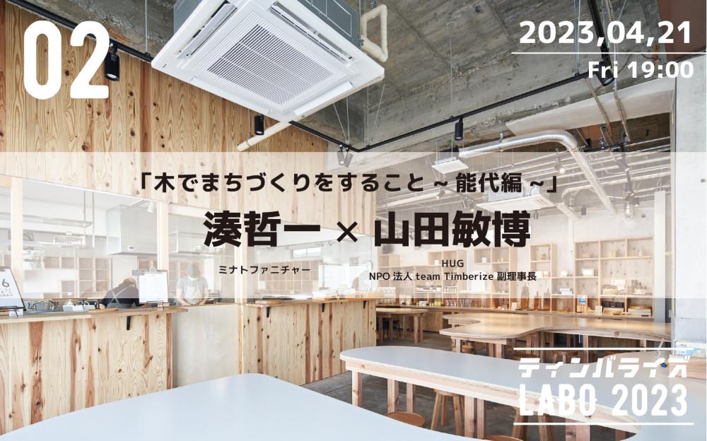 【内容】秋田県能代市で挑戦を続ける湊哲一さん(ミナトファニチャー)をゲストに迎えて、山田敏博(team Timberze)との座談会を行います。木でまちづくりを実践している湊さんにまちづくりのコツと可能性を話していただきます。後半は参加者の方々にワークショップ形式で、能代の街やマルヒコビルヂングを面白くするアイデアを考えて発表していただきます。まちづくりに興味がある方は必見です!