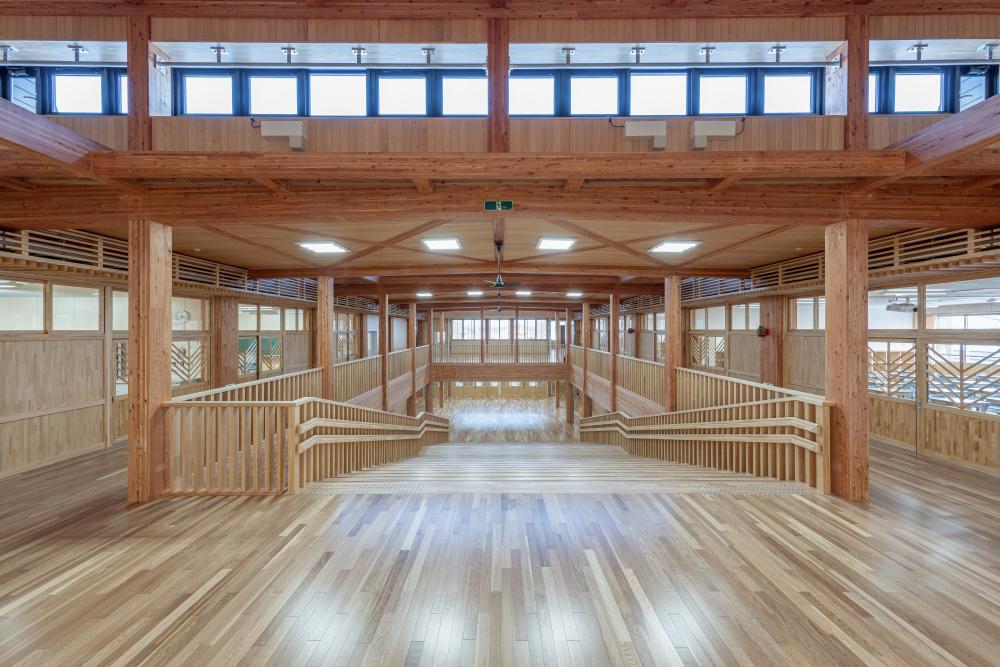 防火区画も木造の延床面積6,000m2弱の純木造校舎。接合金物が見えずシンプルな架構が広がりを感じさせてくれます。