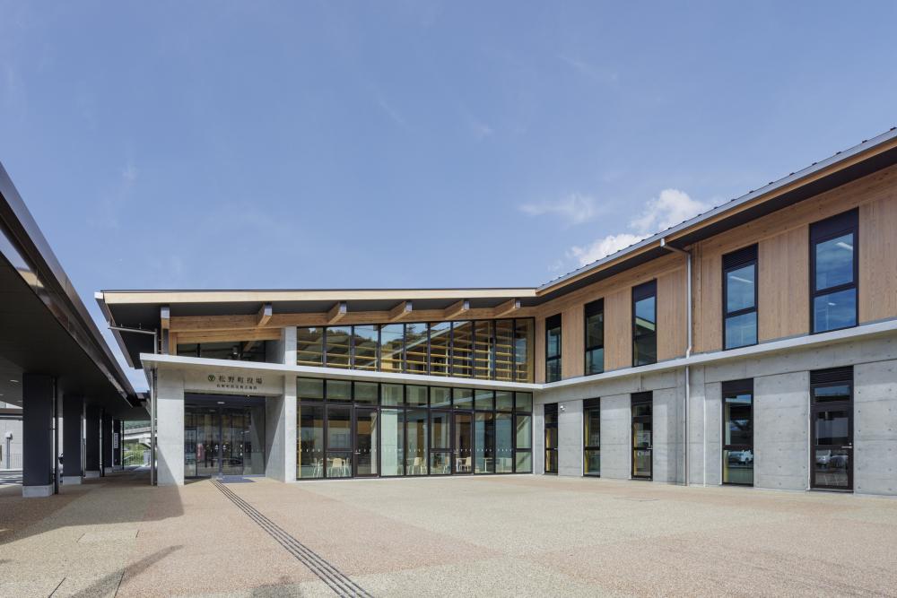 1階はRC造、2階はサミットHR工法(集成材ラーメン架構)とサミットCLT工法を採用した混構造の庁舎。集成材やCLTは町有林のスギ材を使用しています。