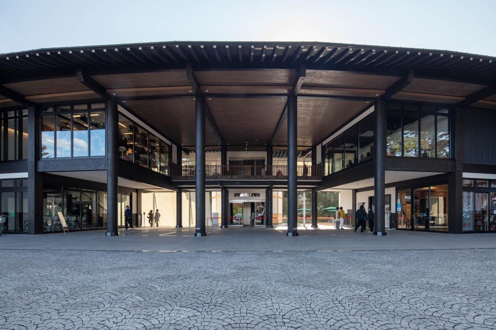 木造2階建て観光商業施設。スケルトンインフィルが可能なラーメン構造は、開放的で可変・流動的空間が求められる商業施設に適しています。