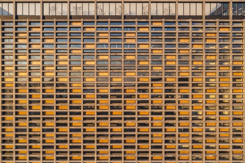 6階建て文化施設の上部2階を木造化し、外周部にLVL耐震パネルを市松状に配したデザインとすることで、建設当時における省CO2建築の最先端モデルを実現した。