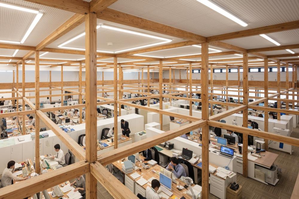 地域産の流通製材で大規模なオフィスをつくる試み。標準スパンを木造住宅と同等の3.64mとし、120角の製材を組み合わせることで、コストを抑えつつ独自性の高い環境を実現した。