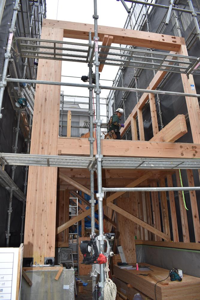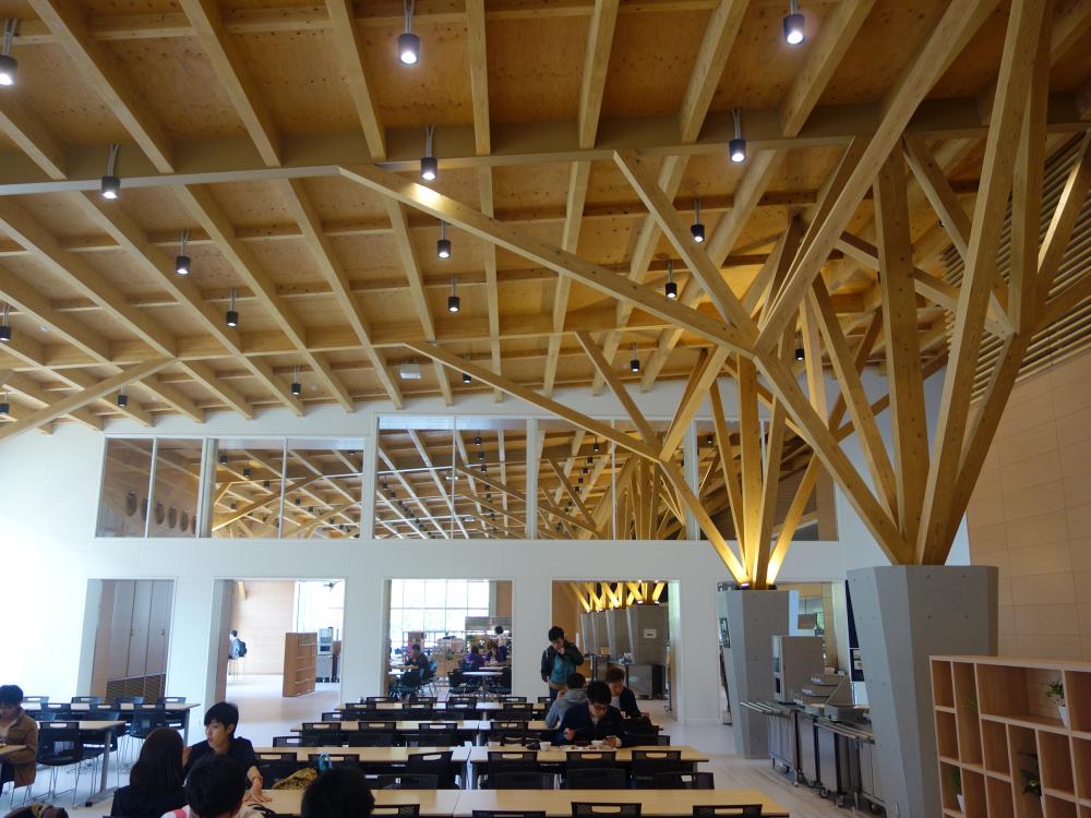 木3学。グリーンコモンズ中央の木造部は、1時間準耐火燃えしろ設計の二方向ラーメン構造。