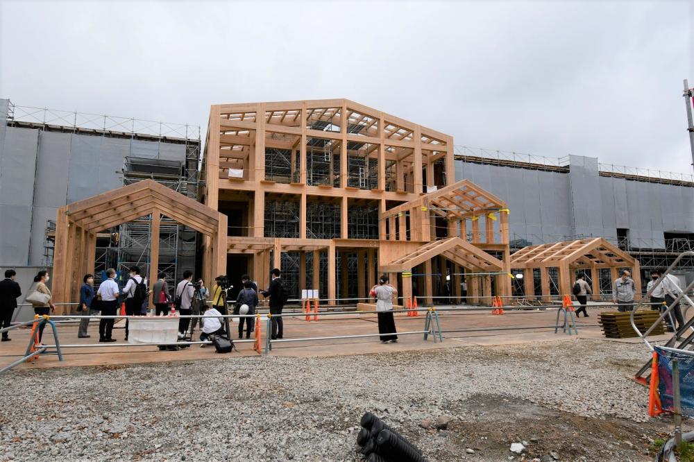 樹状構造。方杖で小屋梁を支えることで大スパンと意匠を両立した構造体。県産材をふんだんに使用し、天井が高く開放的な空間に。