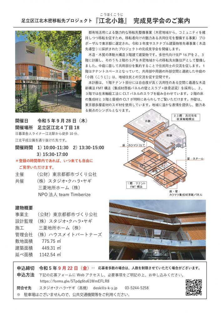 都有地活用による魅力的な移転先整備事業(木密地域から、コミュニティを維持しつつ移転を促すため、移転者向けの魅力ある共同住宅を整備する事業)プロポーザルで東京都に選定され、令和3年度サステナブル建築物等先導事業 ( 木造先導型 ) に採択されたプロジェクトの完成見学会を開催します。