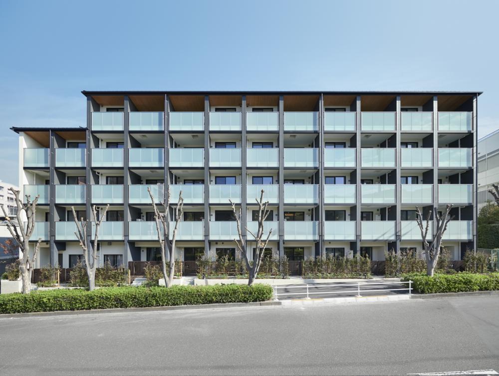 モクシオン稲城は、「木造マンション」という言葉を世の中に定着させる契機となった建物である。地上5階建てのうち、上層4層を枠組壁工法の1時間耐火構造とし、2時間耐火構造が求められる1階を鉄筋コンクリート造としている。上層の木造部分は、強化せっこうボードを使ったメンブレン耐火構造で、耐火被覆の連続性が重要となるが、柱型、梁型のでない枠組壁工法の強みを活かしながら、設計と施工の合理性を向上させている。さらに躯体のツーバイフォー材に国産カラマツ等を採用するなど、国産材利用にも積極的に取り組んでいる。