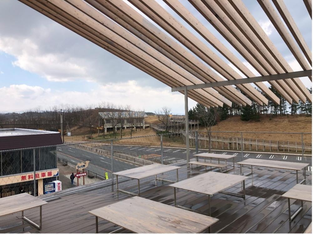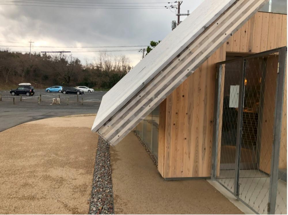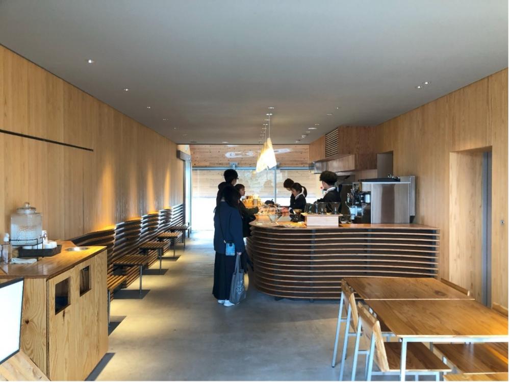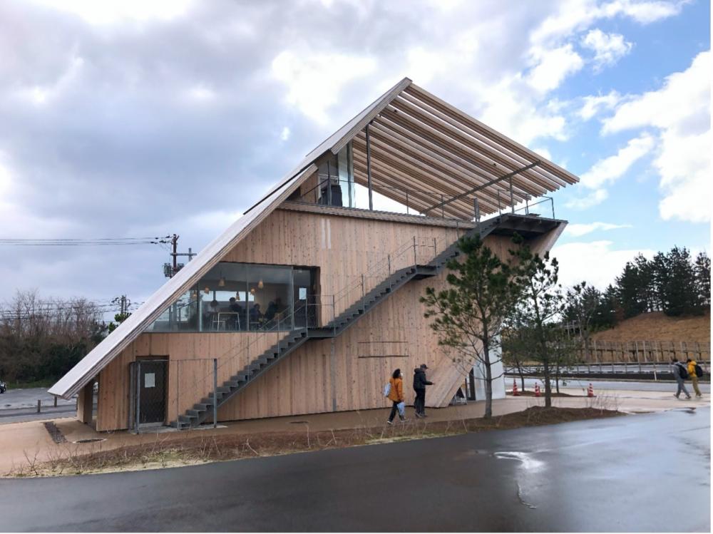 次に訪れたのは、鳥取砂漠、ではなく鳥取砂丘沿いにある「タカハマカフェ」です。このカフェは隈研吾さんの設計で大成建設施工、2022年に竣工しています。構造はCLTとRCのハイブリットとのことですが、先程の日の丸産業ビルと対象的に清々しいくらい木を外部、内部に表していました。